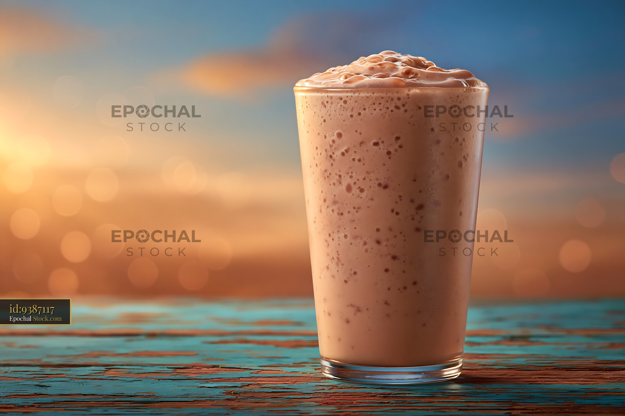 A refreshing plum wine cream milkshake served in a clear glass on a weathered wooden surface, set against a warm and dreamy sunset background, evoking feelings of indulgence and summer relaxation.