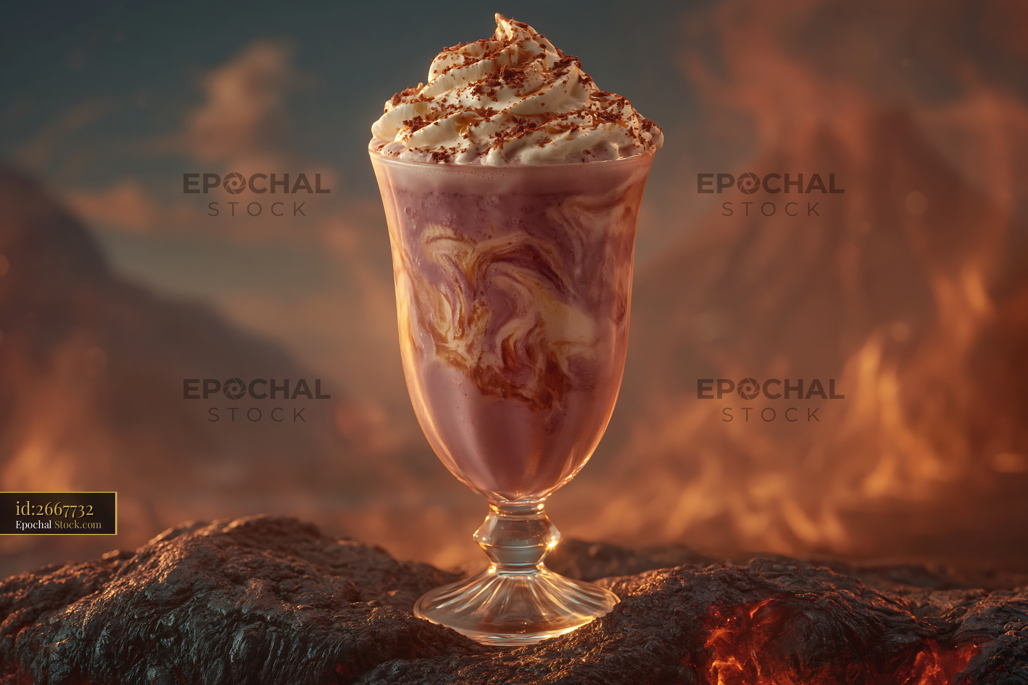 A decadent plum wine cream milkshake topped with whipped cream and cocoa, placed upon a dark volcanic landscape with a glowing, fiery background, evoking a sense of intense indulgence and fantasy.