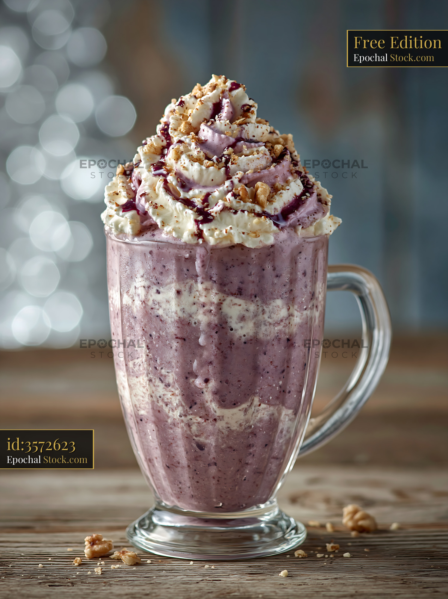 A decadent plum wine cream milkshake served in a tall glass, garnished with whipped cream, fruit syrup, and chopped nuts. This indulgent treat captures the essence of sophisticated dessert comfort.