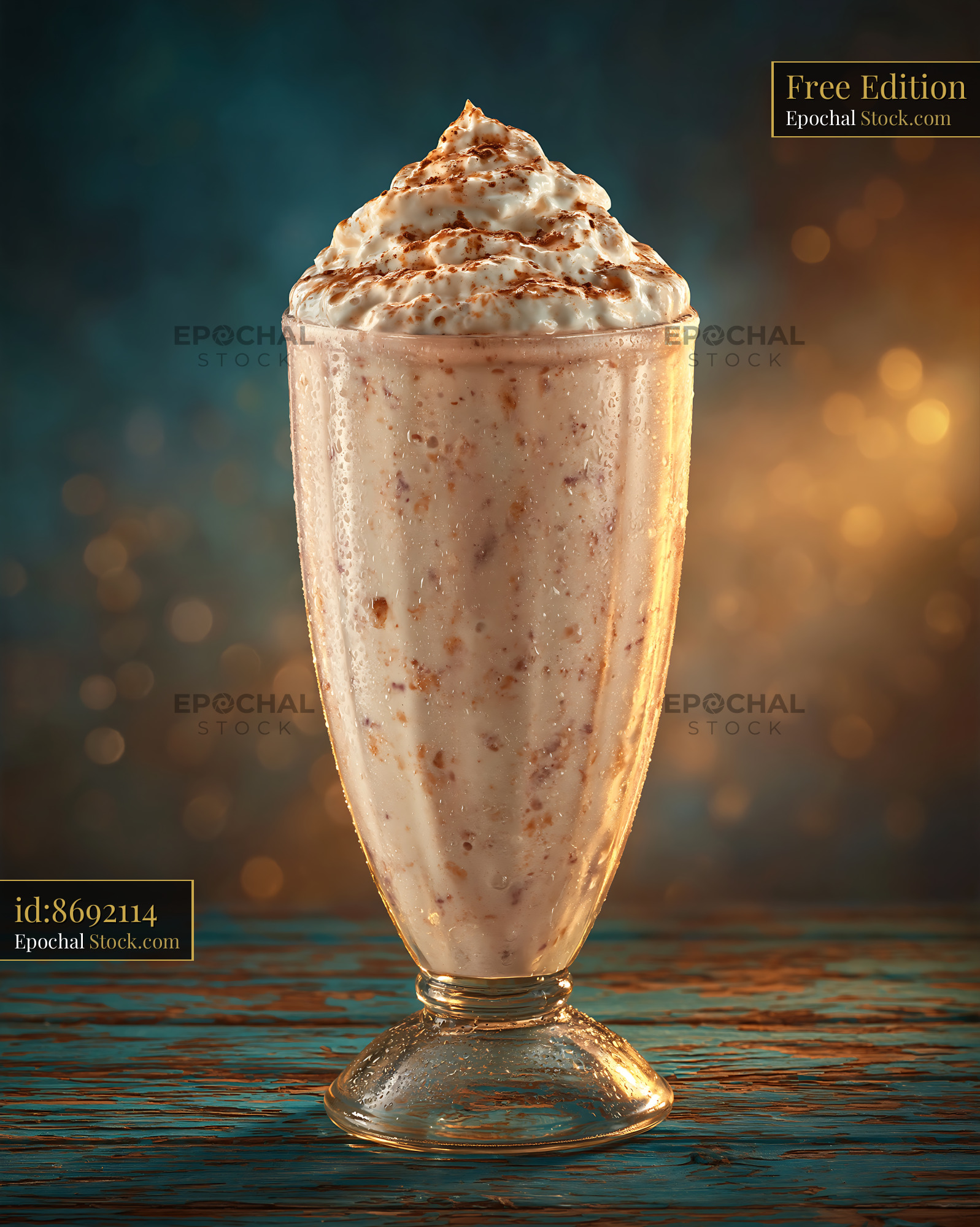 A chilled plum wine cream milkshake topped with whipped cream and cinnamon, standing on a rustic wooden table, evoking a sense of indulgence and sophisticated dessert pleasure.