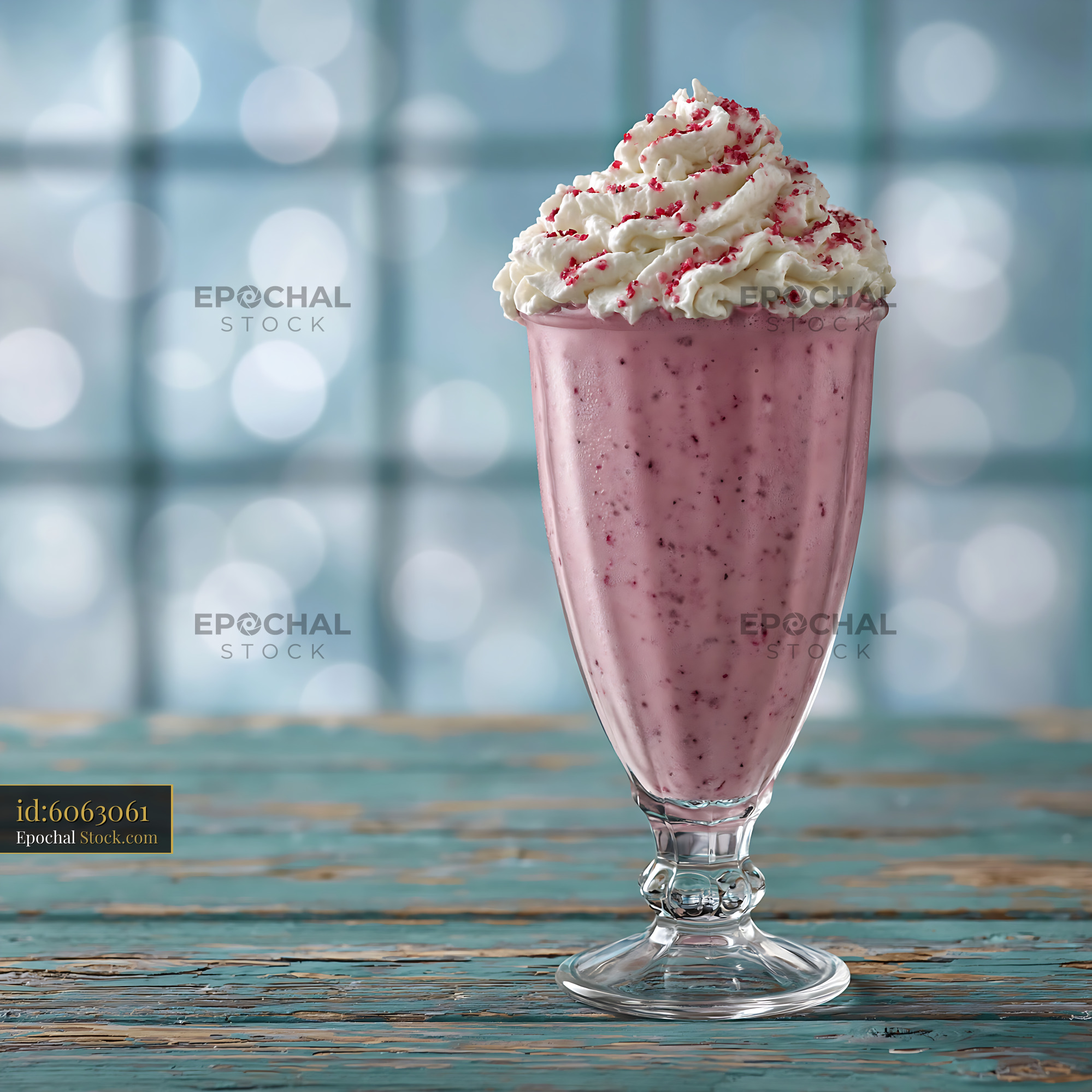 A refreshing plum wine cream milkshake topped with whipped cream and sprinkles, served in a classic glass on a rustic wooden table, evoking a sense of sweet indulgence and culinary delight.