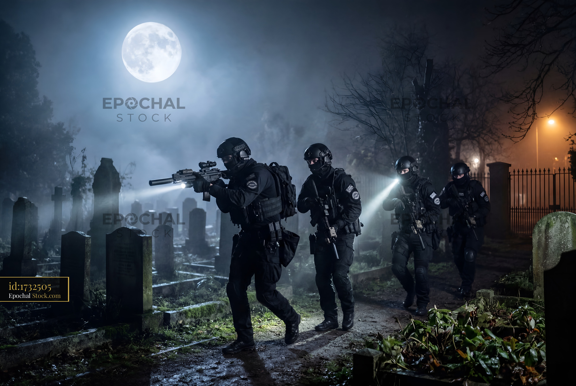 A group of officers moves through a cemetery at night with flashlights. The moon shines brightly above, and shadows fall across the tombstones. The atmosphere is tense as they proceed carefully.