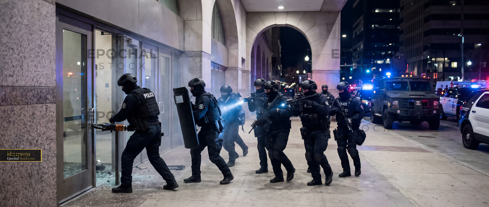 Police force enters building during night operation in city Premium Stock Image