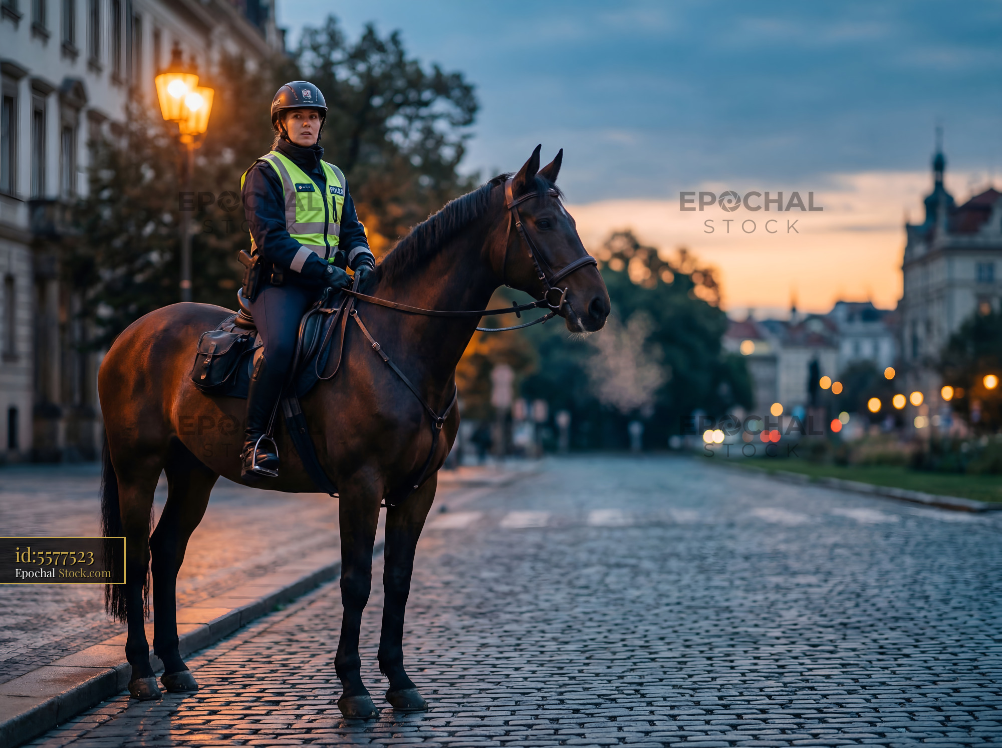 A police officer rides a horse along a cobblestone street during sunset. The officer is dressed in uniform, and city buildings are visible in the background with streetlights glowing.