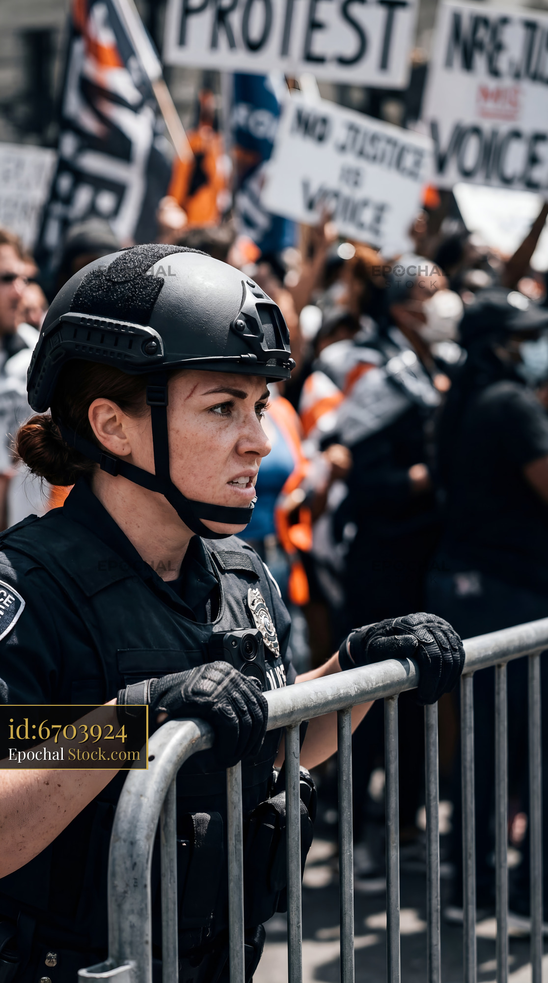 Police officer stands guard at protest in the city street Premium Stock Image
