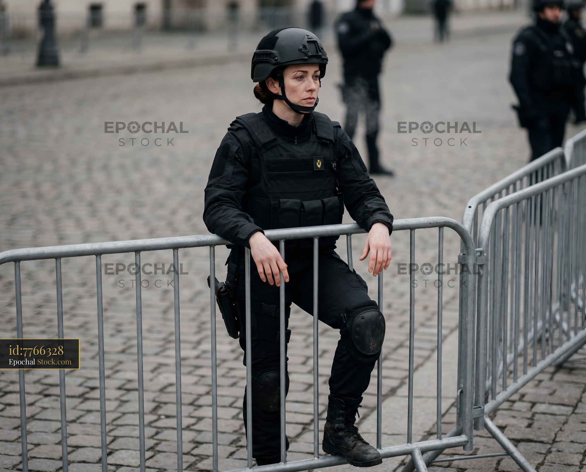 Police officer stands guard by barricade in city square Premium Stock Photo