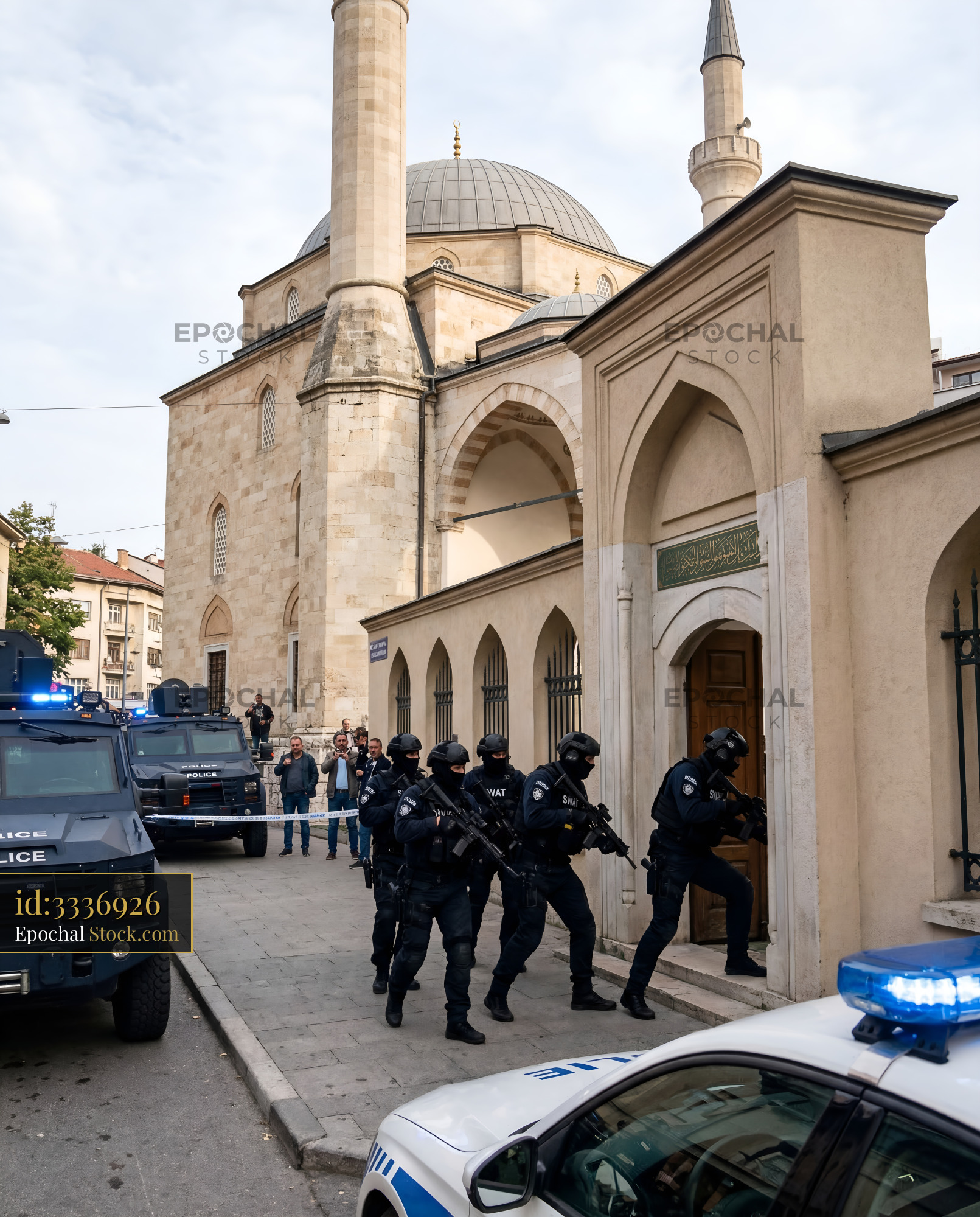 Police officers conduct a raid outside a mosque in the city Premium Stock Image