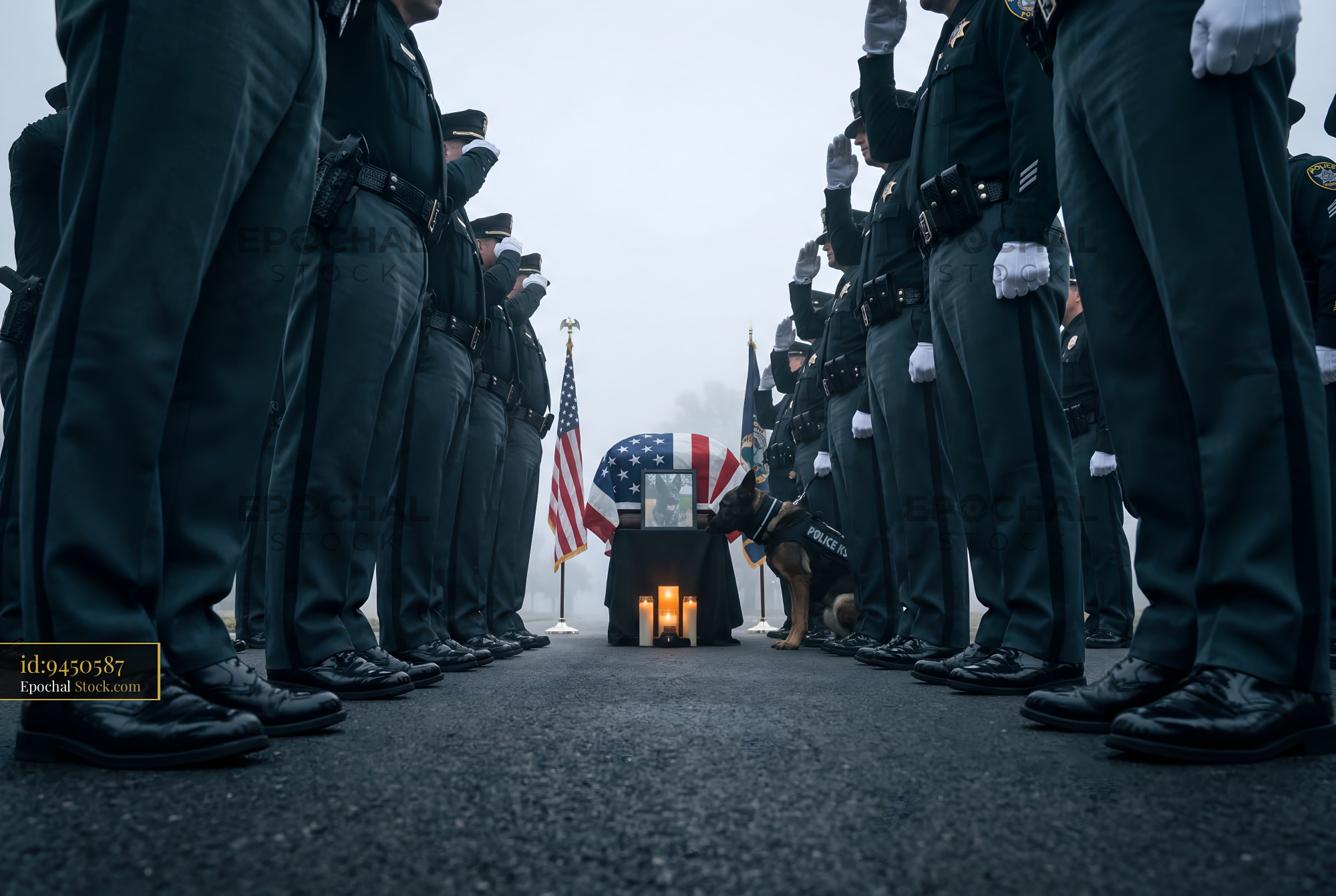 A group of police officers stand in formation, saluting as a casket draped with an American flag is escorted. A candle burns nearby, marking the ceremony's significance.