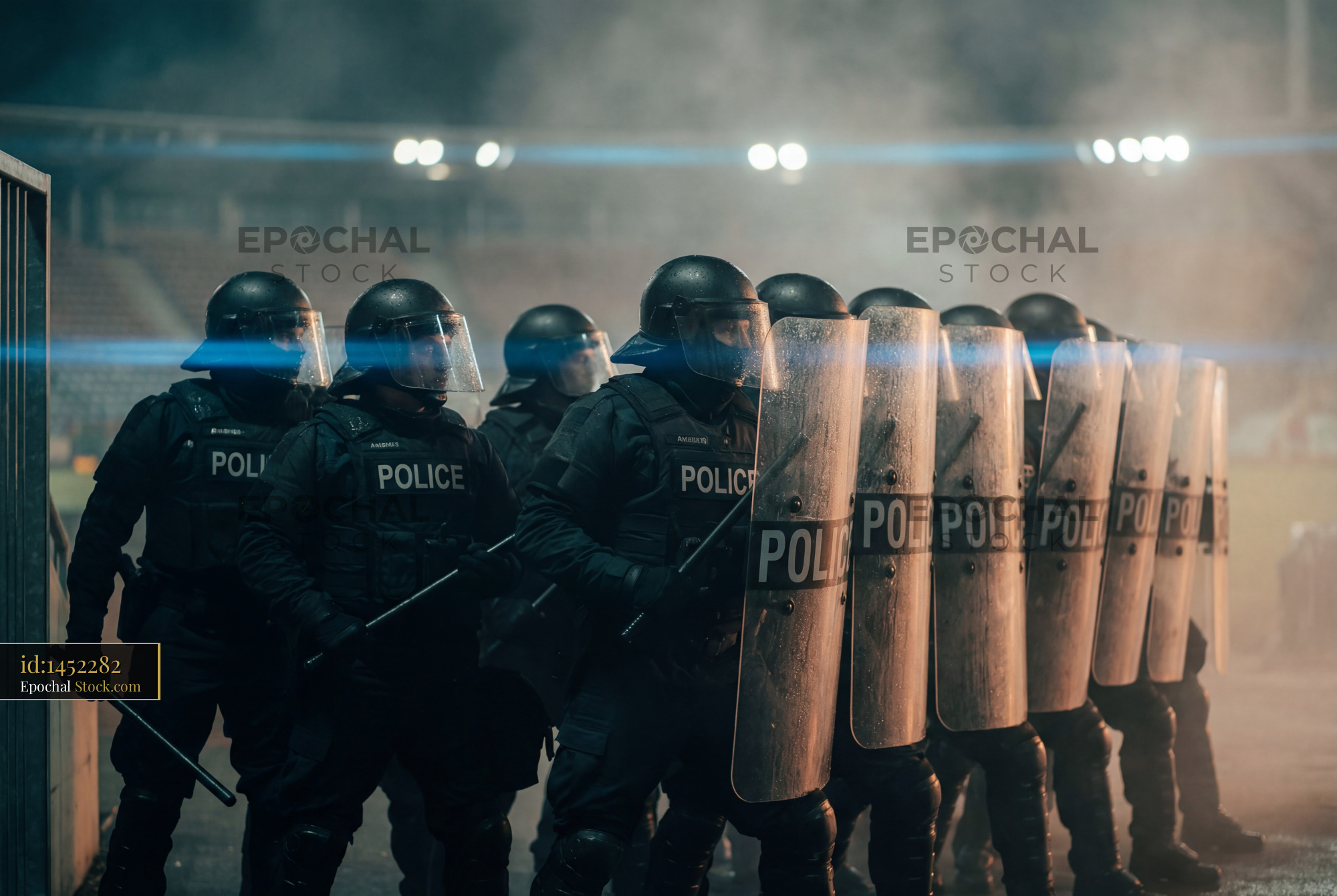 Several police officers stand in a line at night. They wear helmets and carry shields. The scene is smoky and tense, with lights in the background.