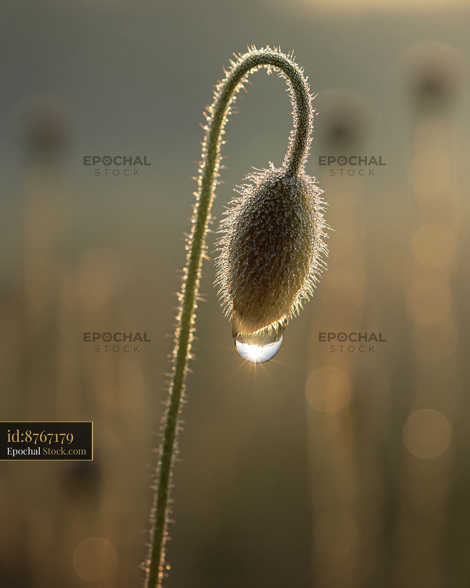 A delicate poppy bud is covered in tiny dew drops at sunrise. A single large water drop catches the morning sun, creating a brilliant starburst effect against a soft bokeh background.
