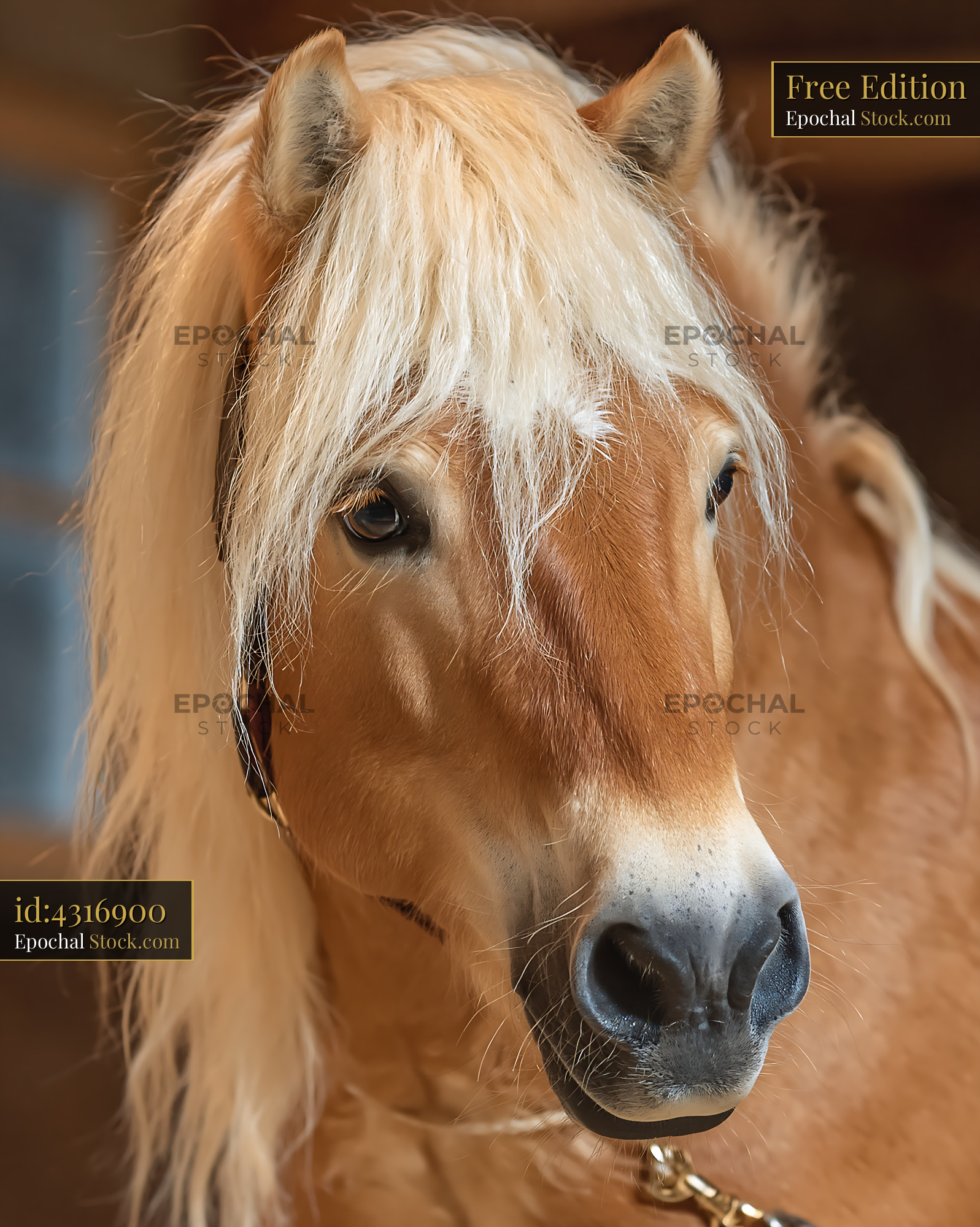 Portrait of a Haflinger horse with a long flaxen mane in a stable