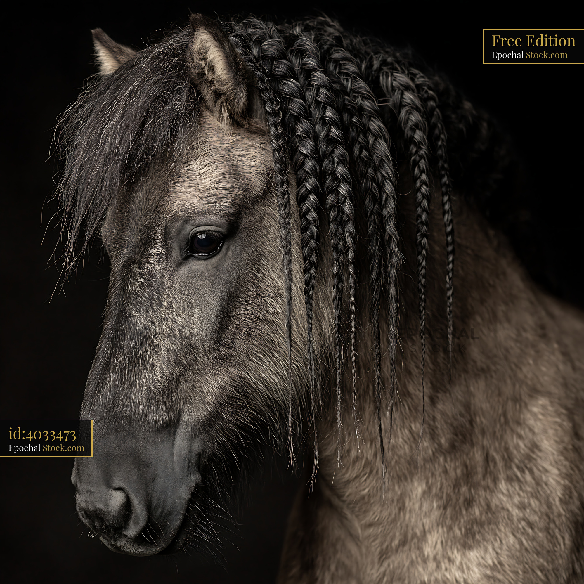 A close-up profile of a grey horse featuring a unique hairstyle with many small braids, set against a black studio background to emphasize elegance and texture.