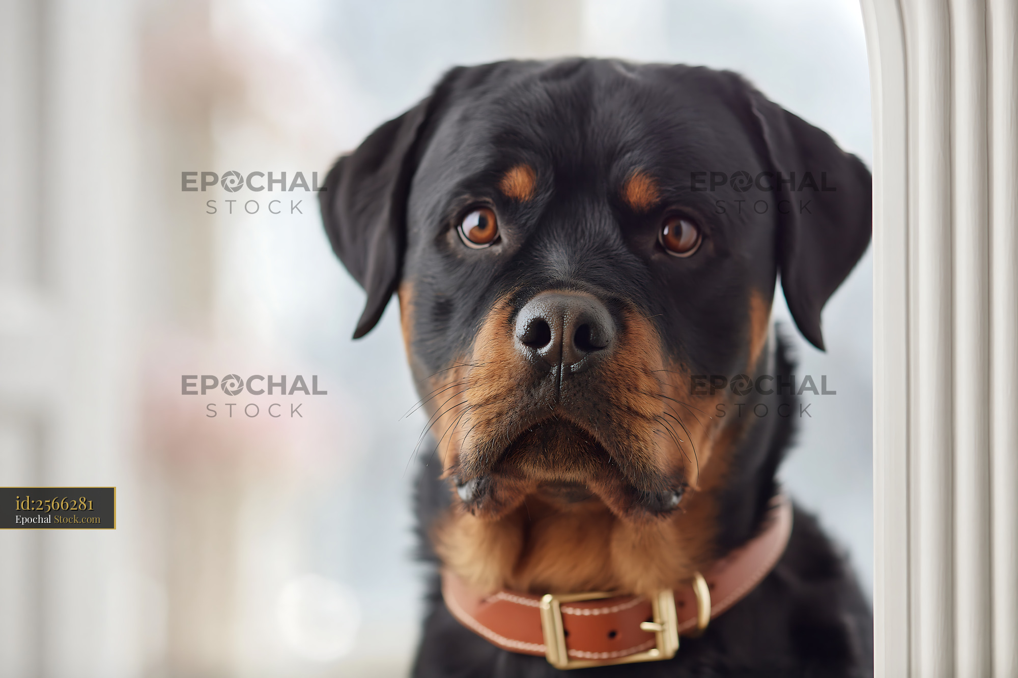 A close-up portrait of a Rottweiler with a gentle expression and a brown leather collar, sitting indoors by a window, conveying loyalty and calm companionship.