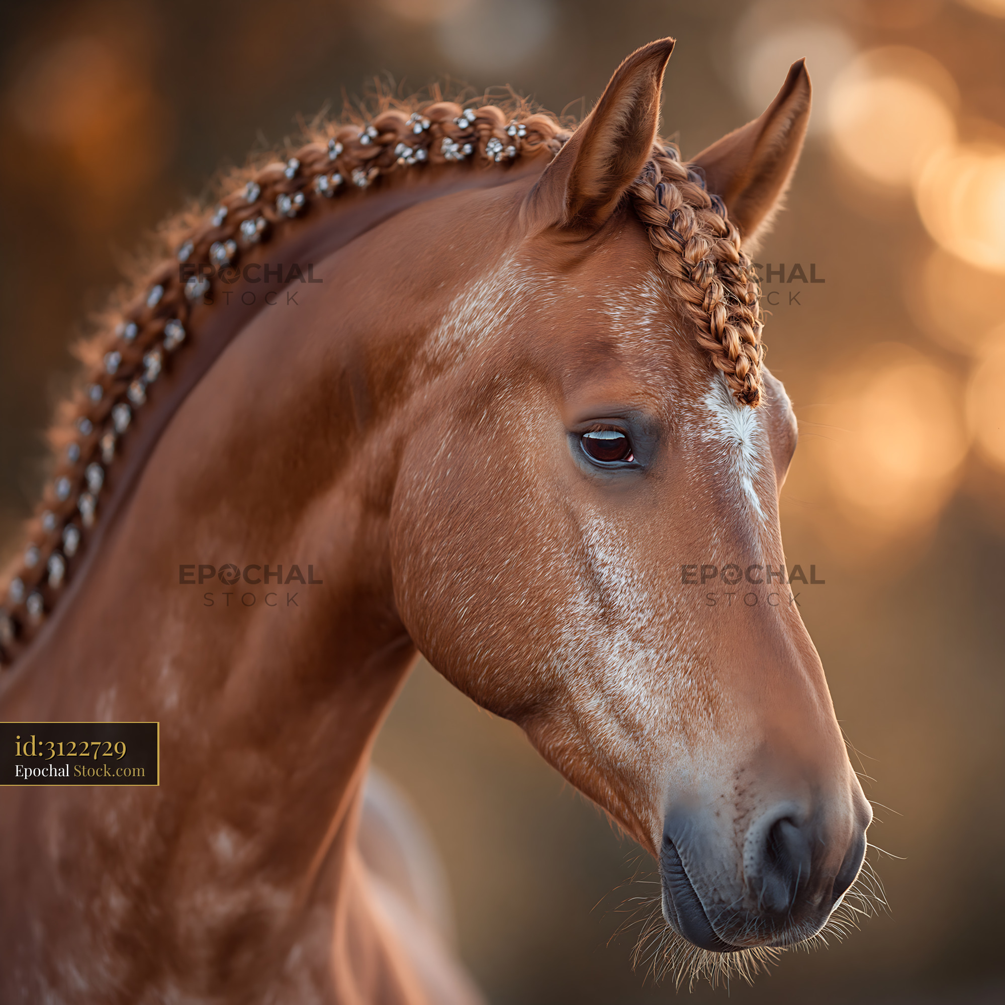 Portrait of an elegant chestnut horse with braided mane at golden hour
