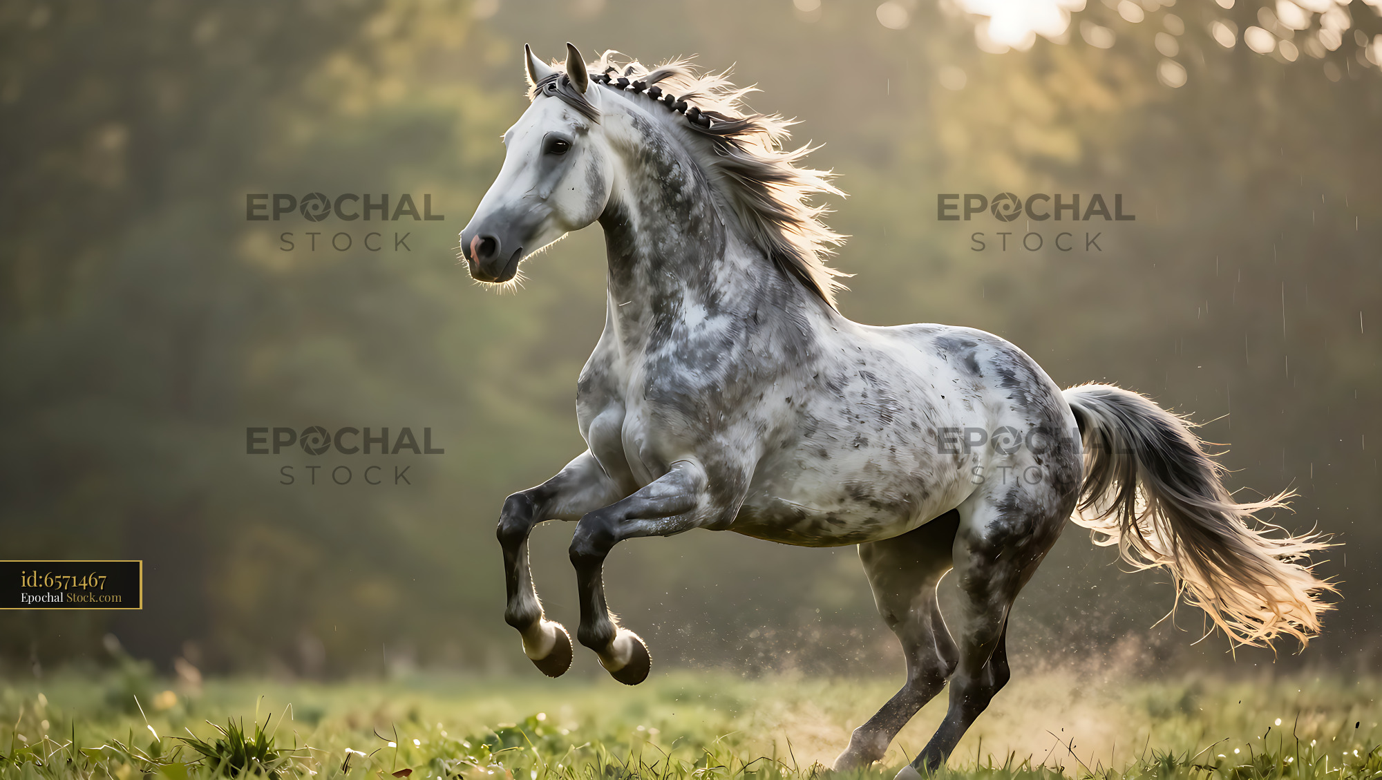 A majestic dapple gray horse exhibits power and grace while galloping through a sunlit pasture at sunset, evoking themes of freedom, wild spirit, and natural beauty.