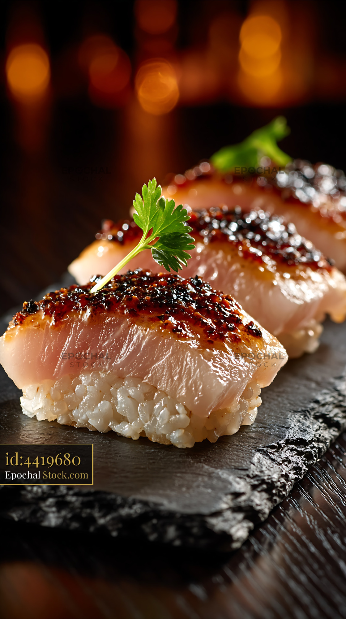 Three pieces of gourmet hamachi nigiri are elegantly presented on a dark stone plate, featuring a truffle glaze and warm bokeh background for a luxurious fine dining atmosphere.