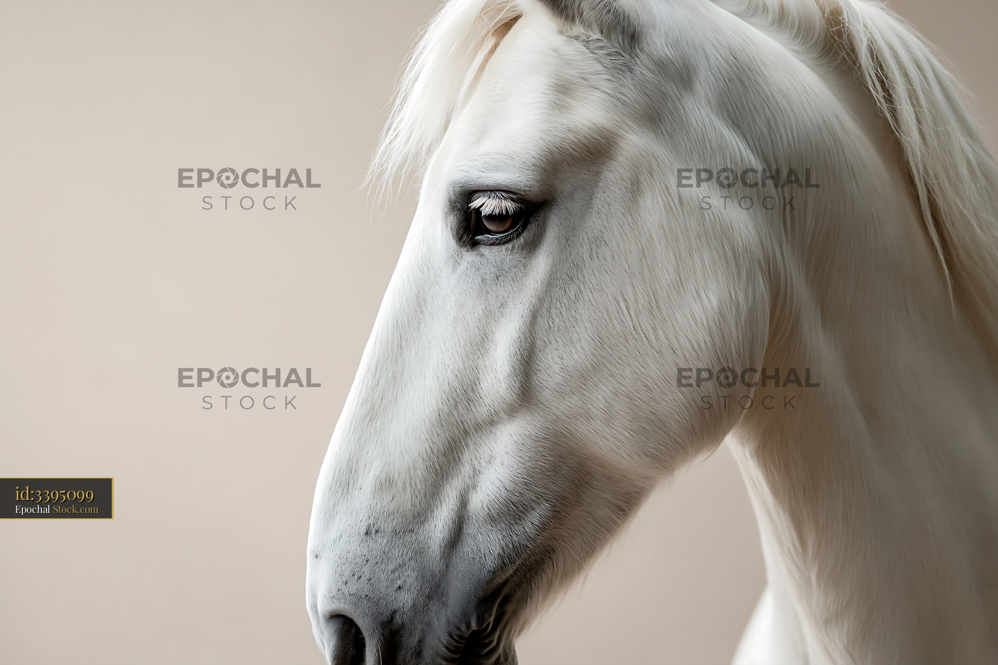 A close-up profile shot of a stunning white horse, capturing its elegant features and calm expression. The soft lighting and minimalist background emphasize the animal's grace and natural beauty.