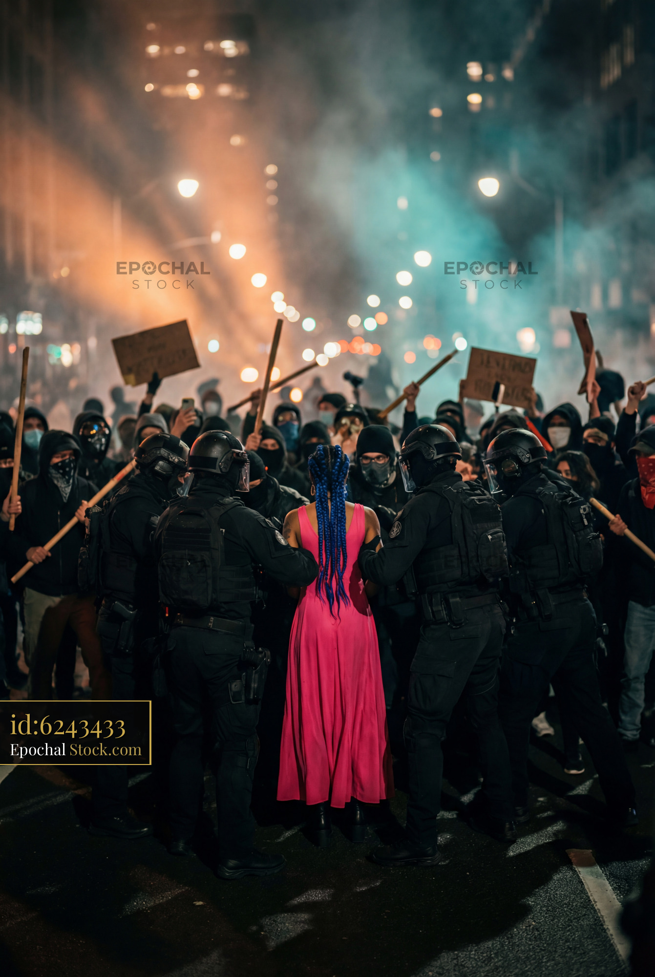 Crowds gather on a city street as protesters face police wearing helmets and masks. Signs are held high while smoke fills the air, creating a tense scene after sunset.
