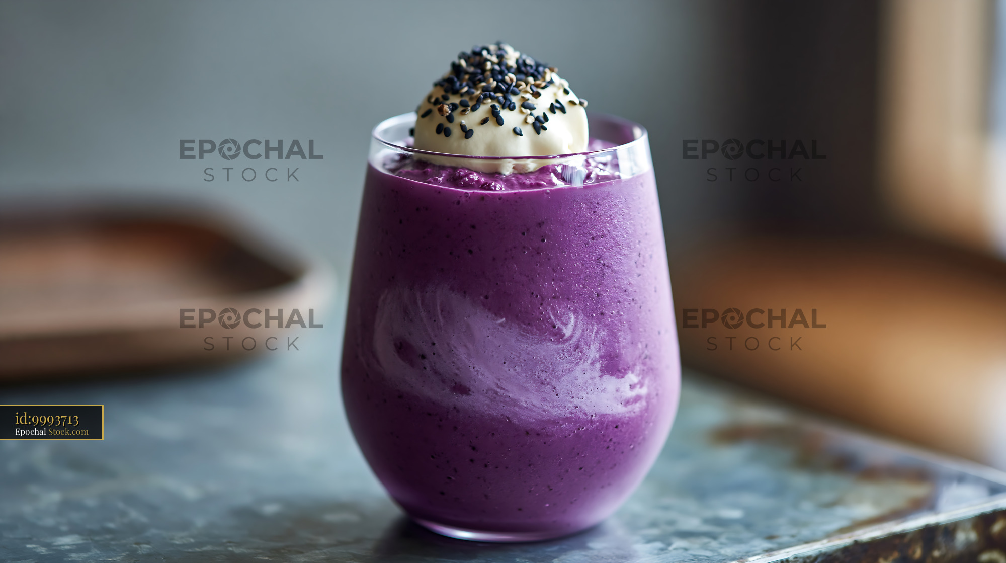 A vibrant purple sweet potato smoothie served in a glass, topped with cream and black sesame seeds, evoking themes of healthy indulgence and exotic Okinawan flavors.