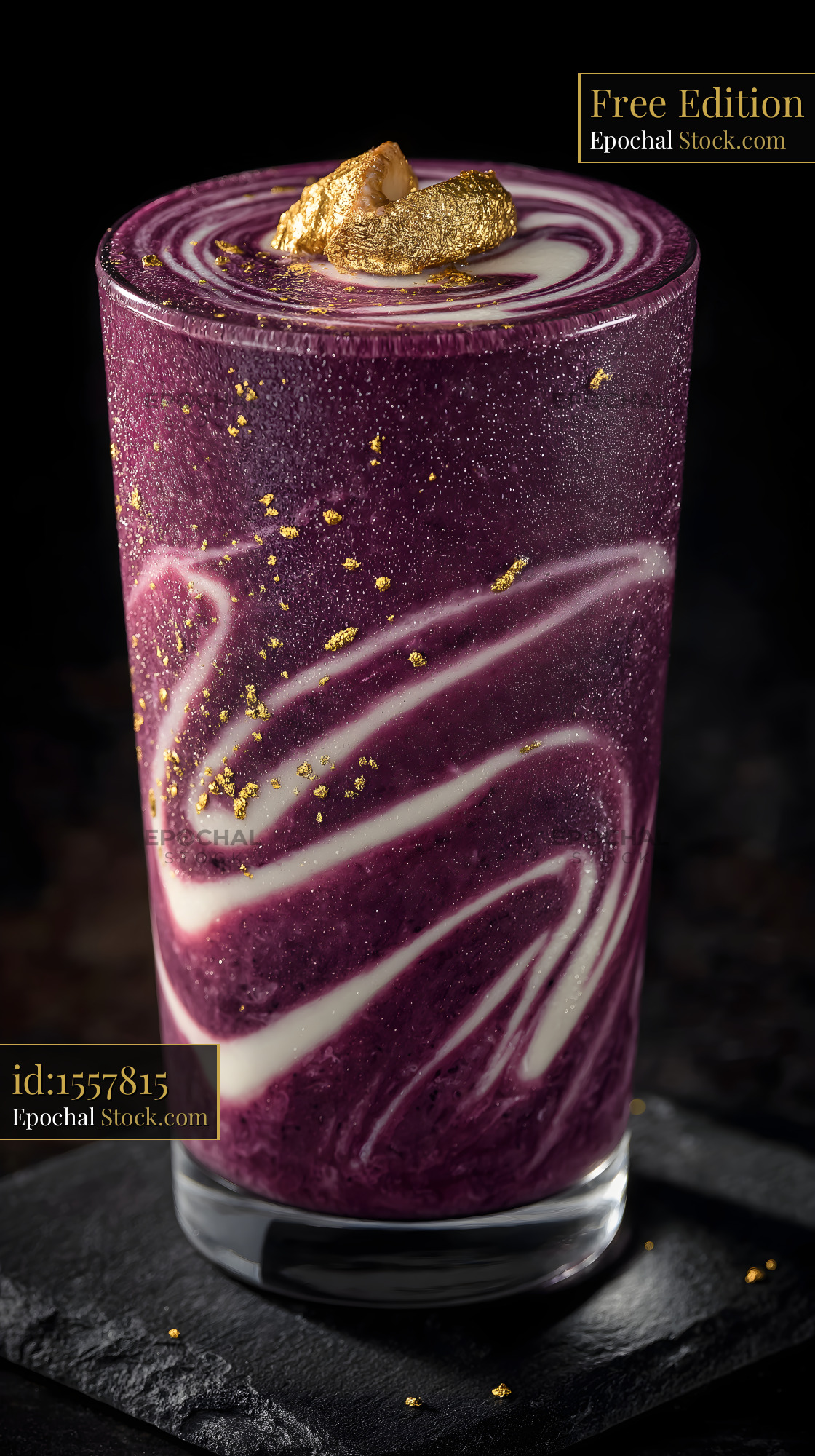 Purple drink with gold topping in glass on black surface Free Premium Stock Photo