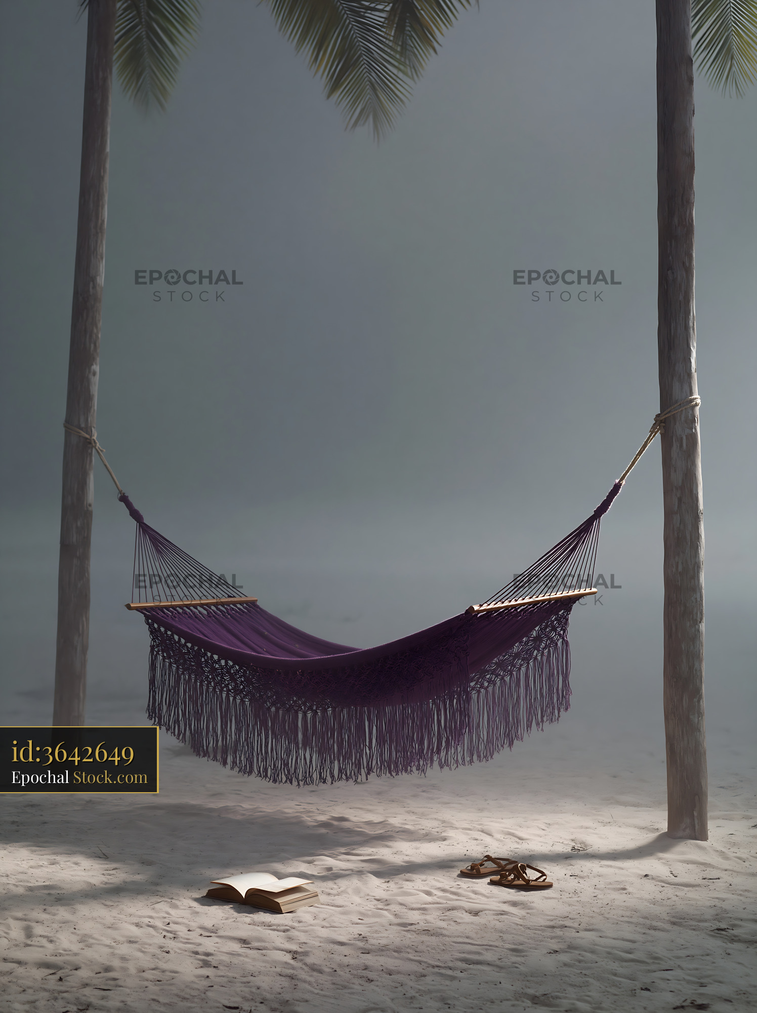A purple fringed hammock hangs between palm trees on a quiet, foggy beach. An open book and sandals on the sand evoke a sense of peaceful solitude and a perfect escape into nature.