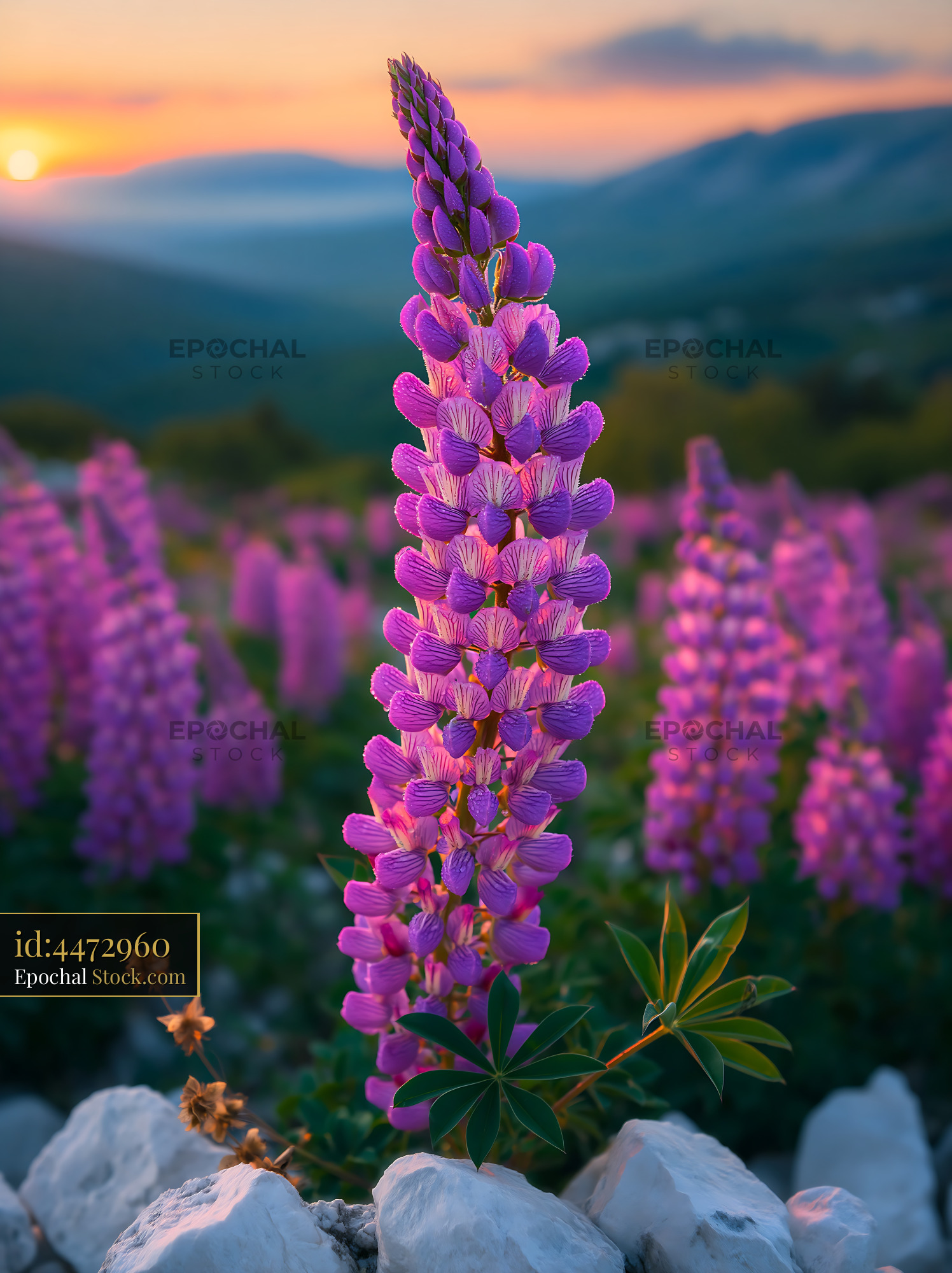 A vibrant purple lupine stands tall in a wildflower meadow. The setting sun casts a warm glow over the rolling hills, evoking a sense of peaceful resilience and natural beauty.