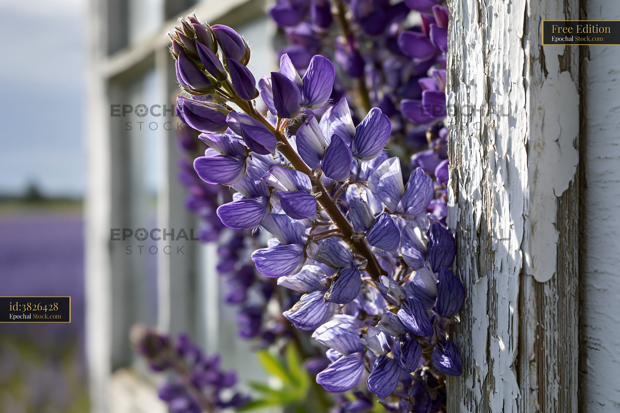 Vibrant purple lupine blooms lean against a rustic white window frame with peeling paint, evoking a nostalgic summer day in the countryside and the charm of cottagecore aesthetics.