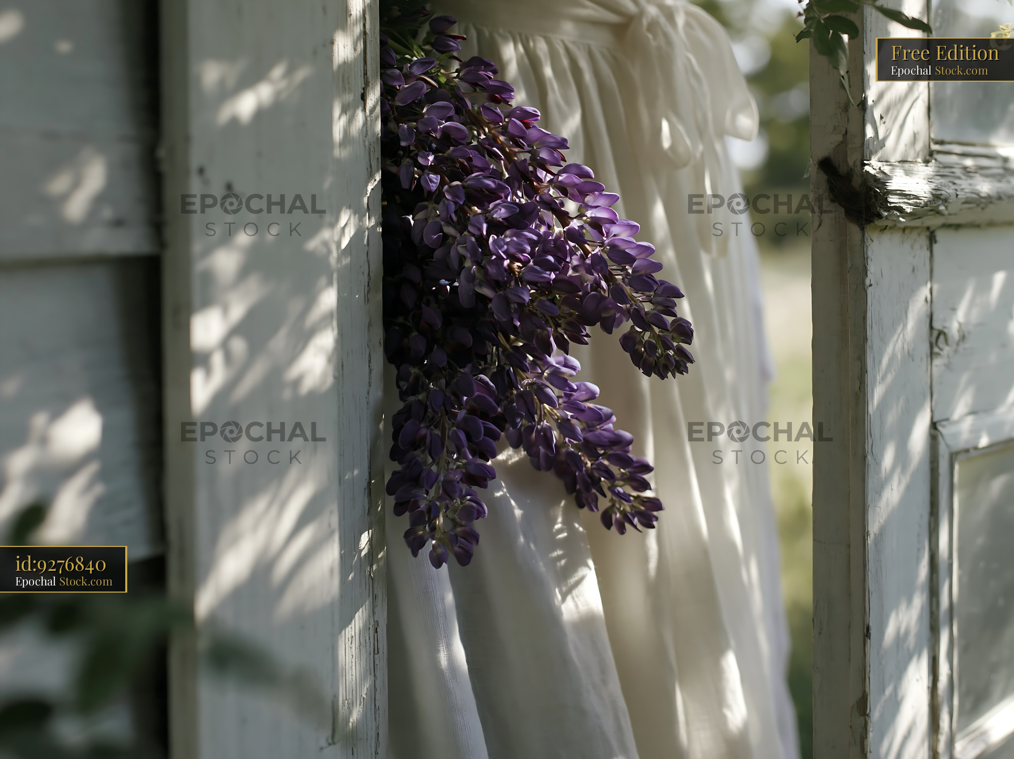 A bunch of vibrant purple lupines rests against a white cotton dress hanging in a weathered wooden doorway, capturing a serene moment of country life and cottagecore aesthetics.