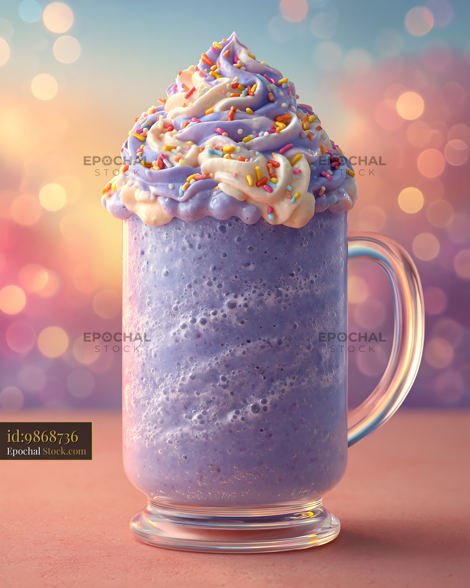 A vibrant purple plum wine cream milkshake is topped with colorful sprinkles and whipped cream, set against a dreamy bokeh background to evoke a sense of whimsical indulgence.