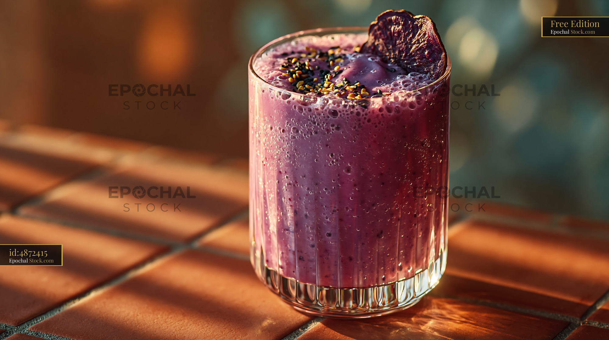 A vibrant purple sweet potato smoothie topped with seeds sits on warm terracotta tiles, bathed in golden afternoon light, representing a healthy and energetic plant-based lifestyle.