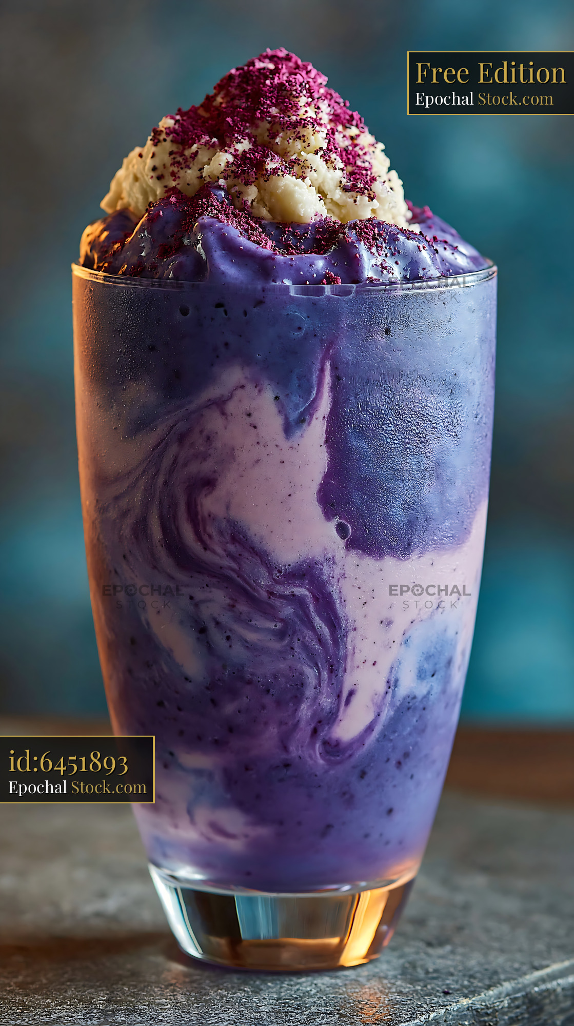 A refreshing ube smoothie with a marbled texture, topped with a scoop of cream and vibrant purple dust, evoking a sense of healthy indulgence and exotic flavors.