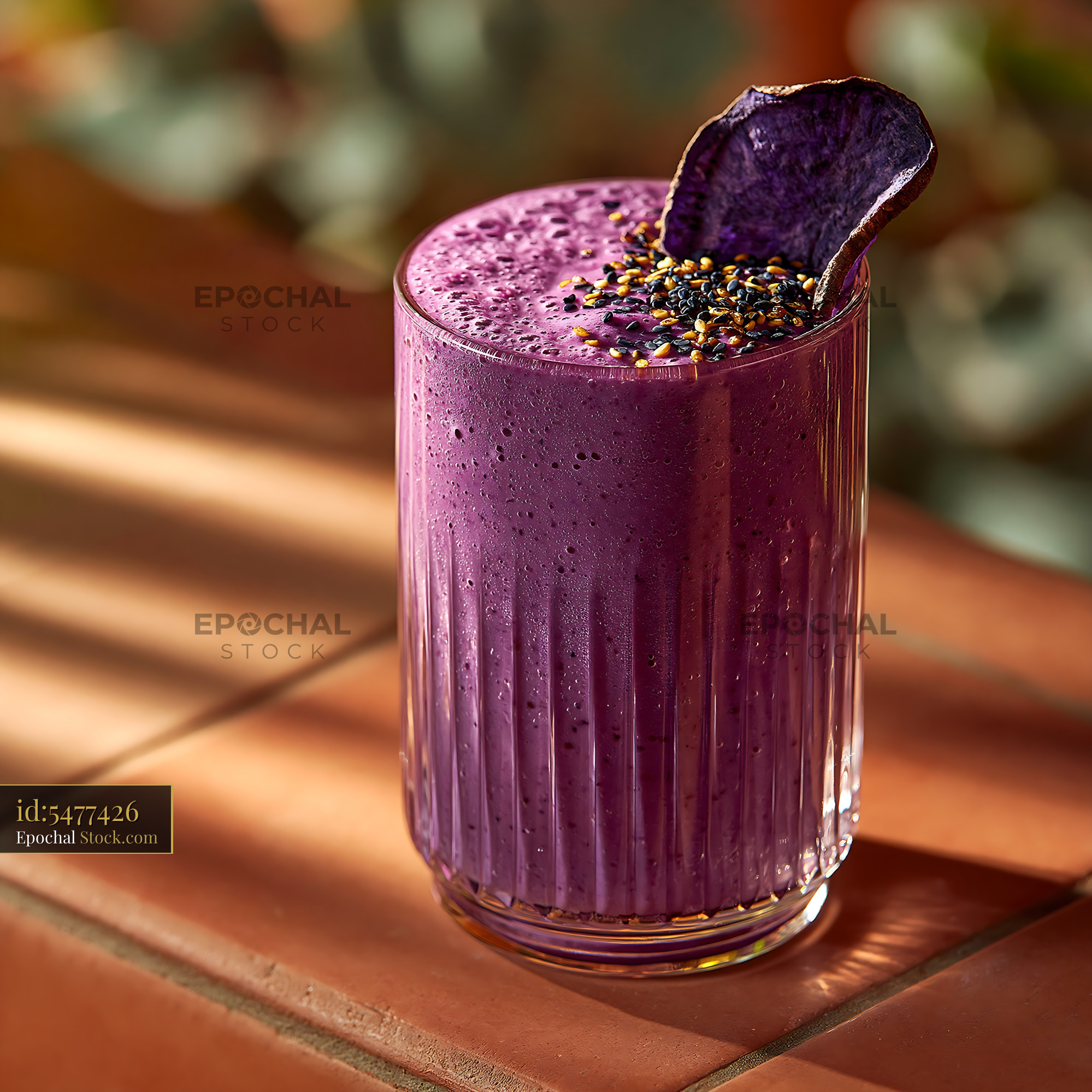 A vibrant ube smoothie topped with sesame seeds and a dried potato slice sits on terracotta tiles, capturing a refreshing moment of wellness in the warm afternoon sun.
