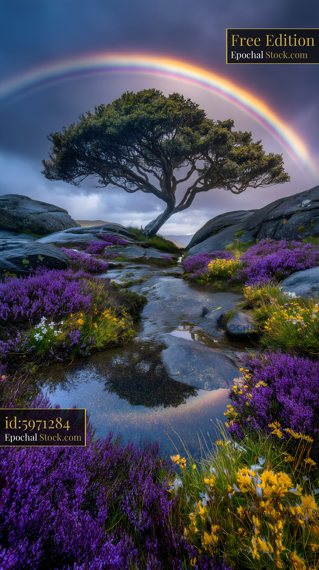 A tree stands alone on a rocky area with flowers around it. A rainbow arches over the scene. Water reflects the tree and sky. The area appears to be a natural space.