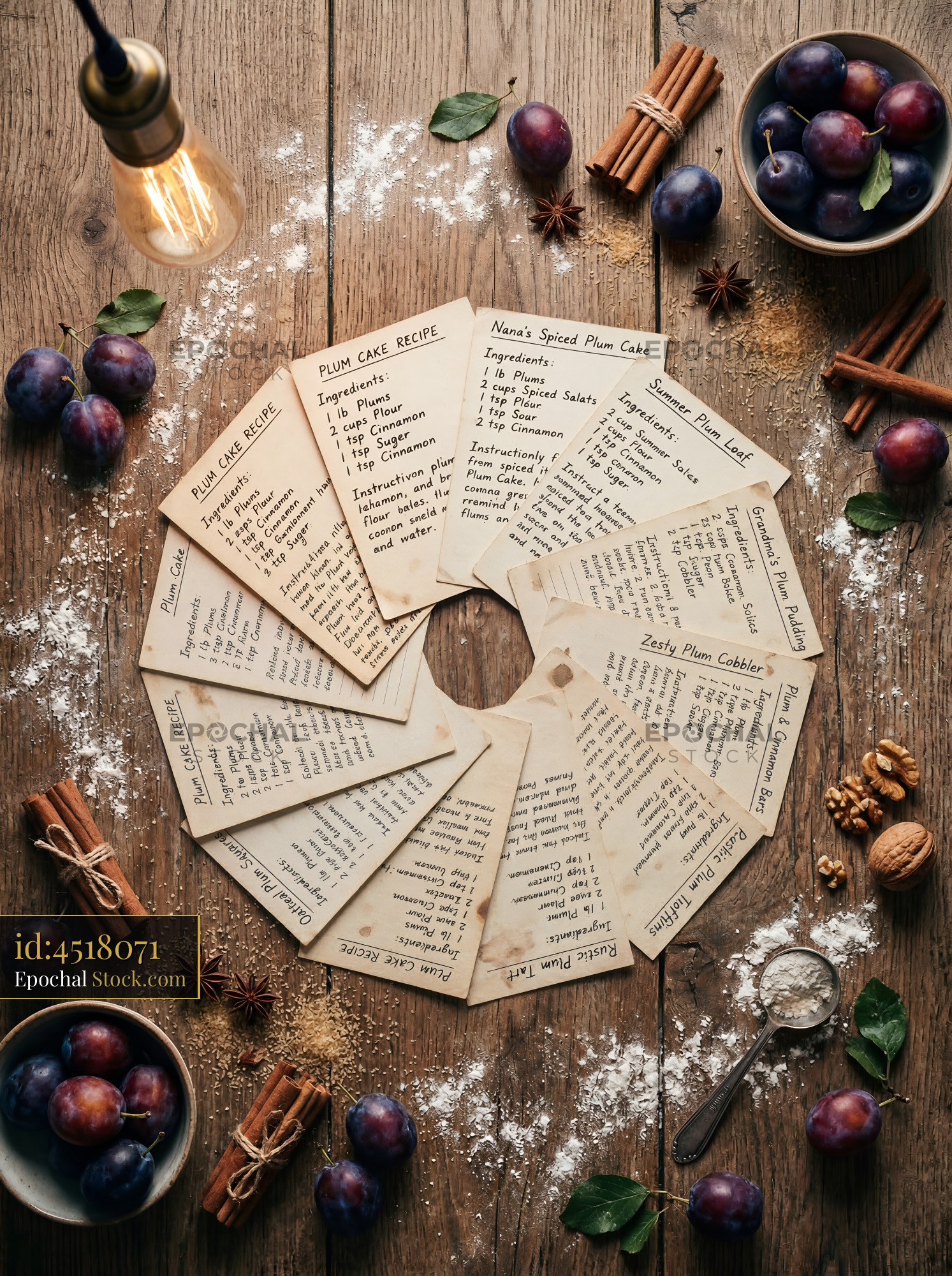 Recipe cards for plum desserts are placed on a wooden surface. Purple plums, cinnamon sticks, and nuts surround the cards in a circle. Flour is scattered around the scene.