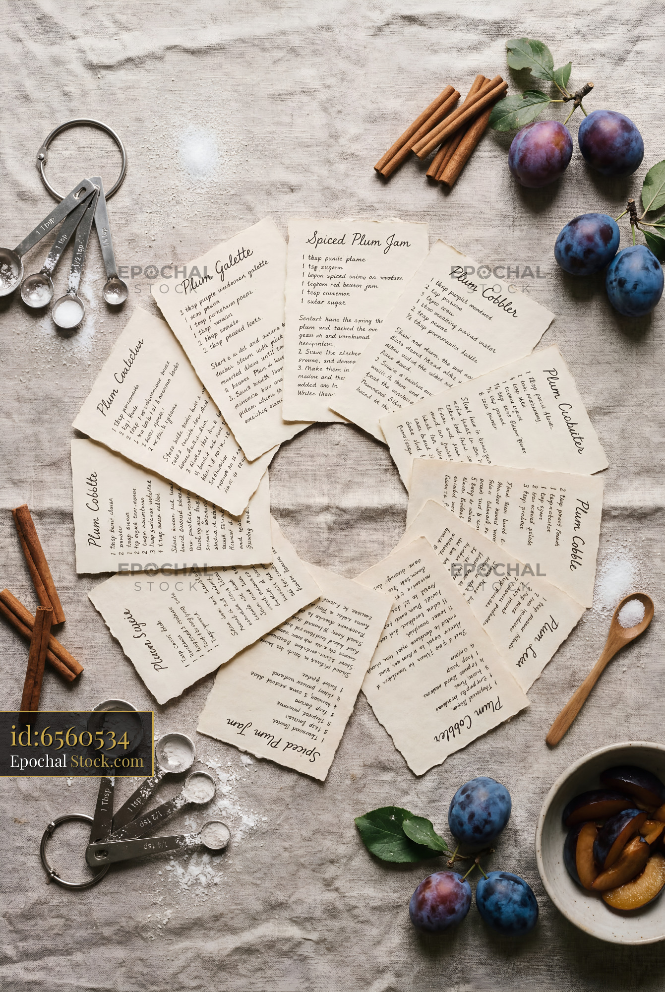 Handwritten recipes for different plum desserts lay on a light cloth. Nearby, there are plums, cinnamon sticks, measuring spoons, and other baking tools. The scene is cozy and inviting.