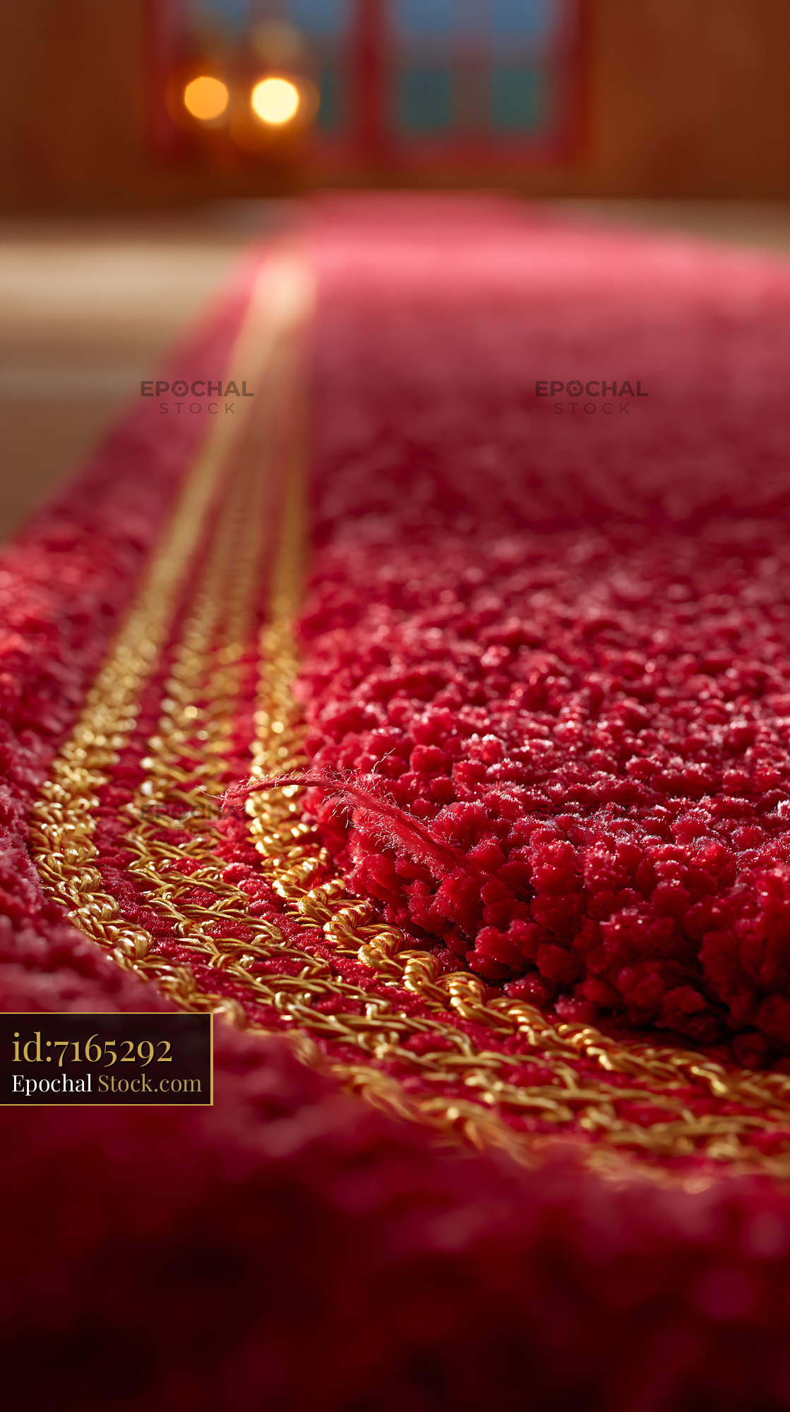 Luxurious red carpet with gold trim stretches into a blurred background of warm lights, evoking themes of success, fame, and a grand arrival at a VIP ceremony.