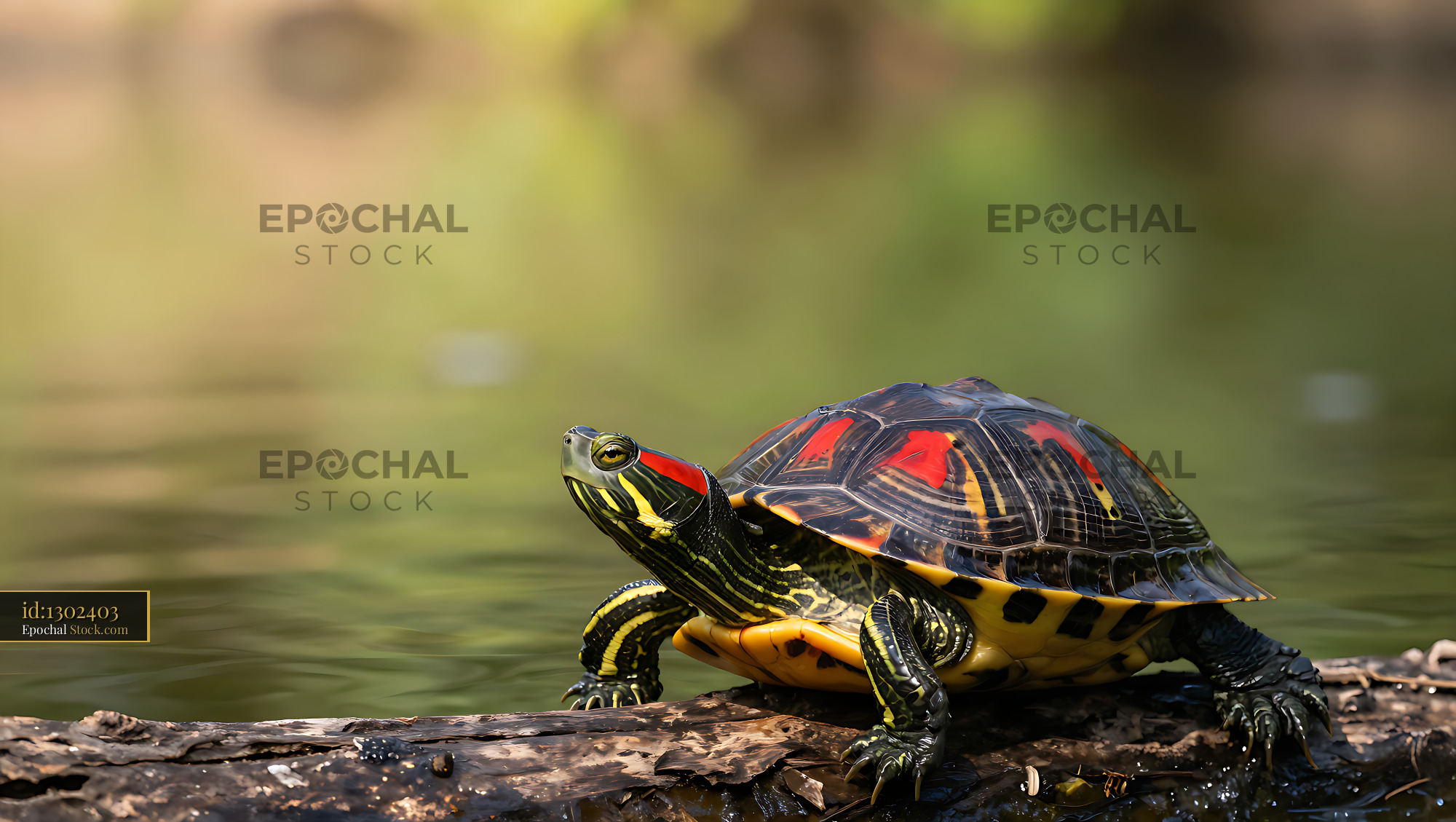 A vibrant red-eared slider turtle rests on a weathered log above calm water, basking in the warm sunlight within its natural aquatic habitat.