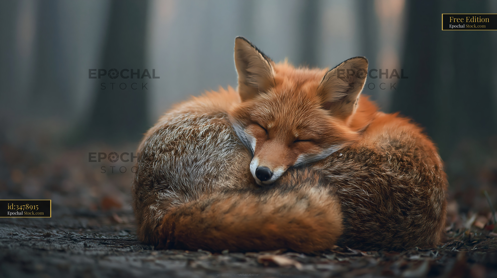 A serene red fox sleeps curled in a ball amidst fallen leaves in a misty autumn forest, evoking a sense of quiet solitude and the peaceful cycle of nature.