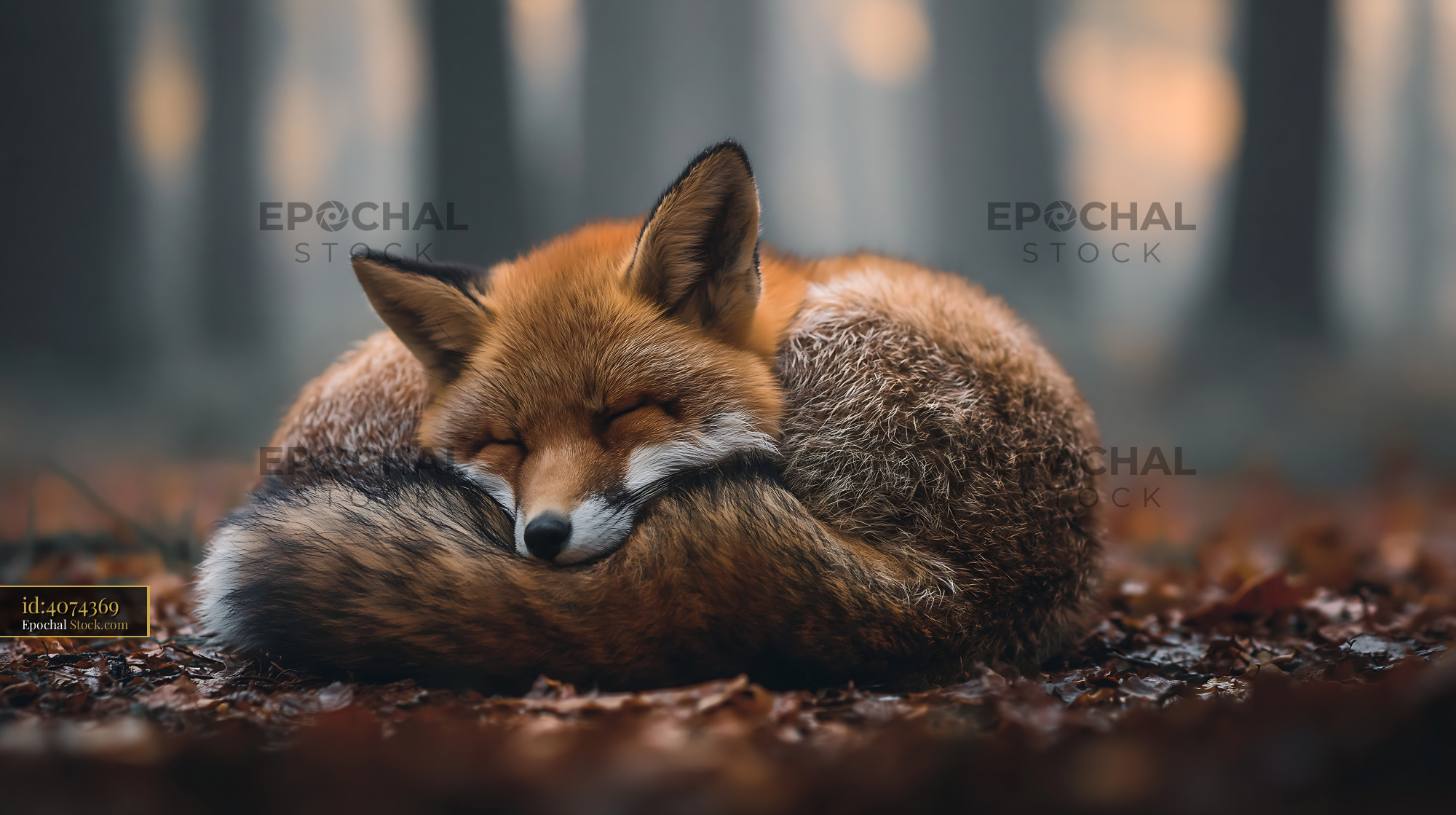 A peaceful red fox curled in a ball sleeps soundly on a bed of fallen autumn leaves, tucked away in the quiet solitude of a misty woodland during the golden hour.