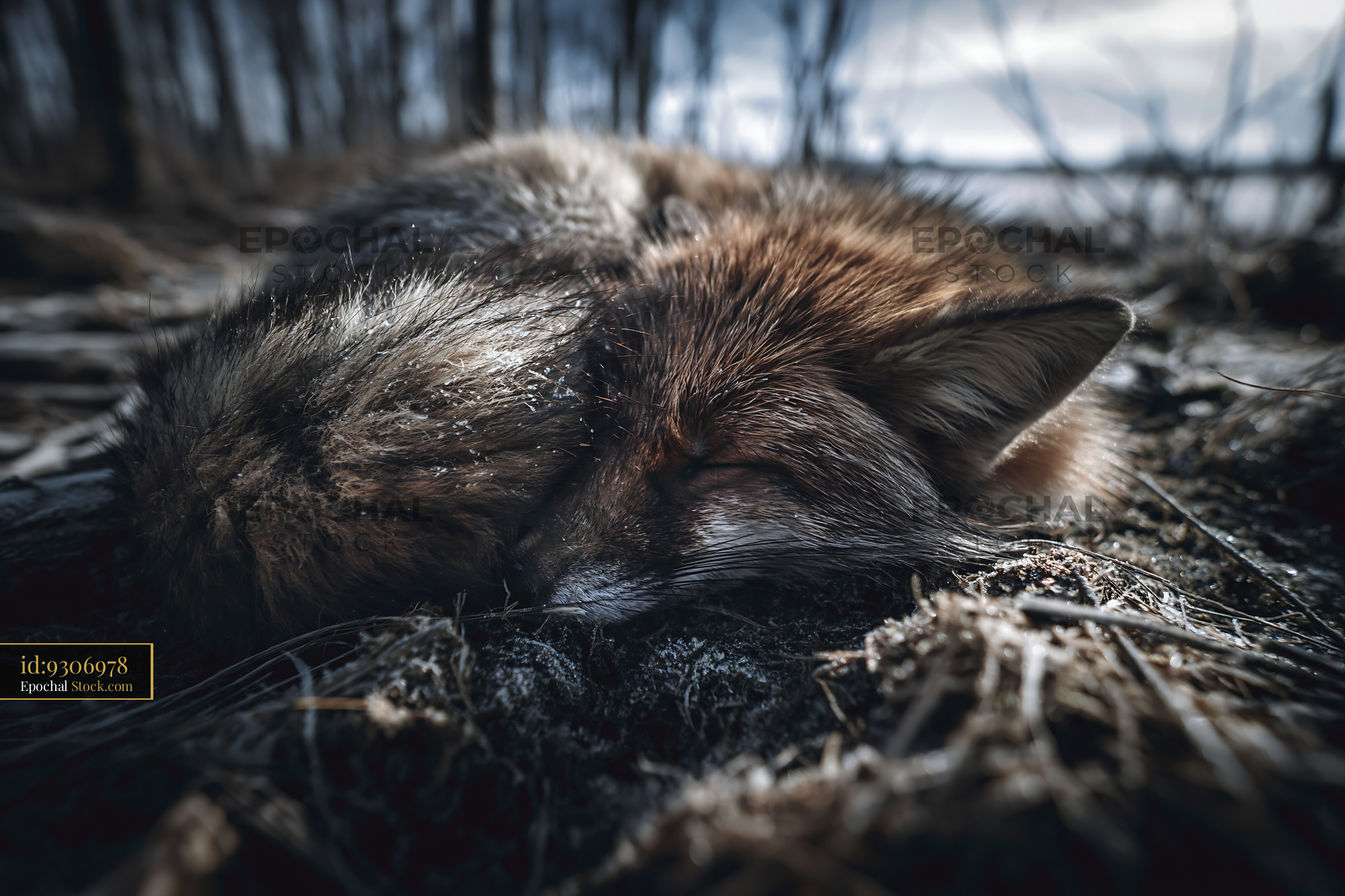A wild red fox rests peacefully on the frozen ground, its fur dusted with frost, capturing a moment of quiet survival and natural beauty in the moody winter wilderness.