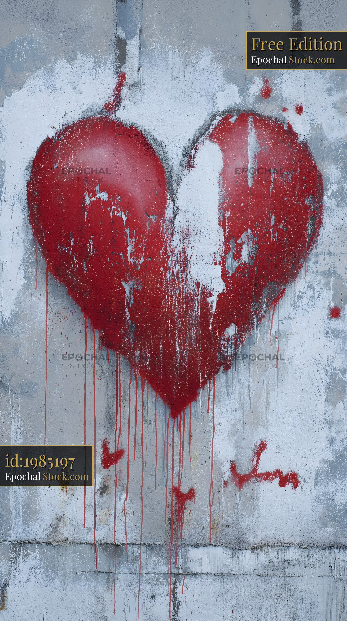 A large red heart is painted on a gray concrete wall. Paint drips down from the heart, creating a striking contrast. This artwork is found in an urban area.