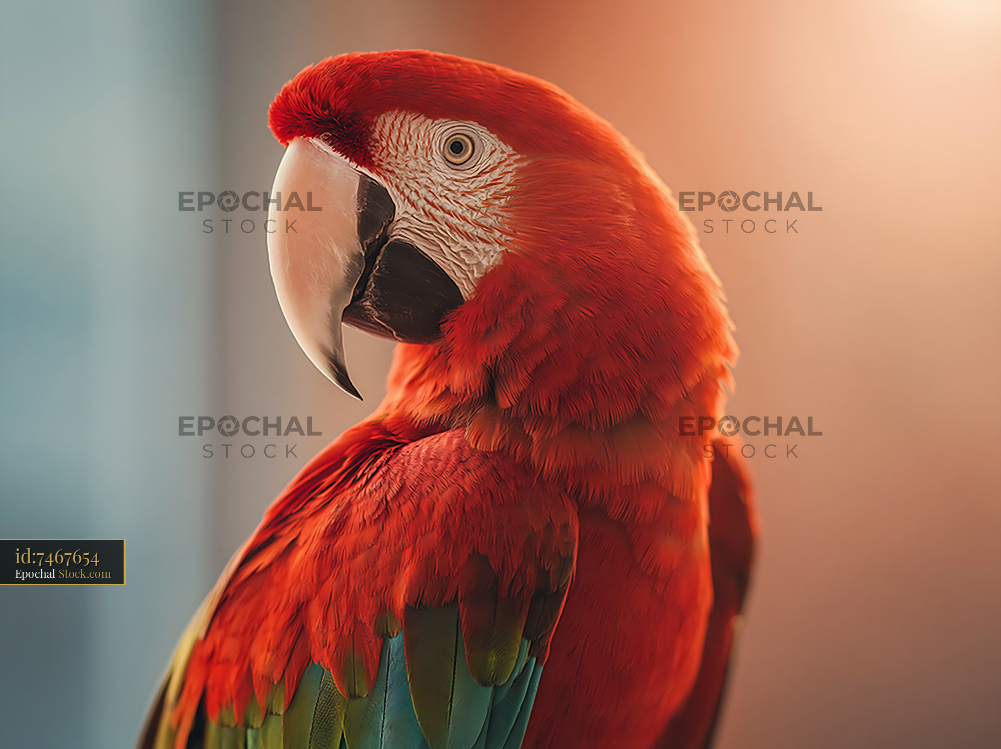 A majestic red macaw gazes thoughtfully into the distance, its vibrant feathers illuminated by a soft golden glow, evoking themes of tropical elegance, wild freedom, and quiet wisdom.