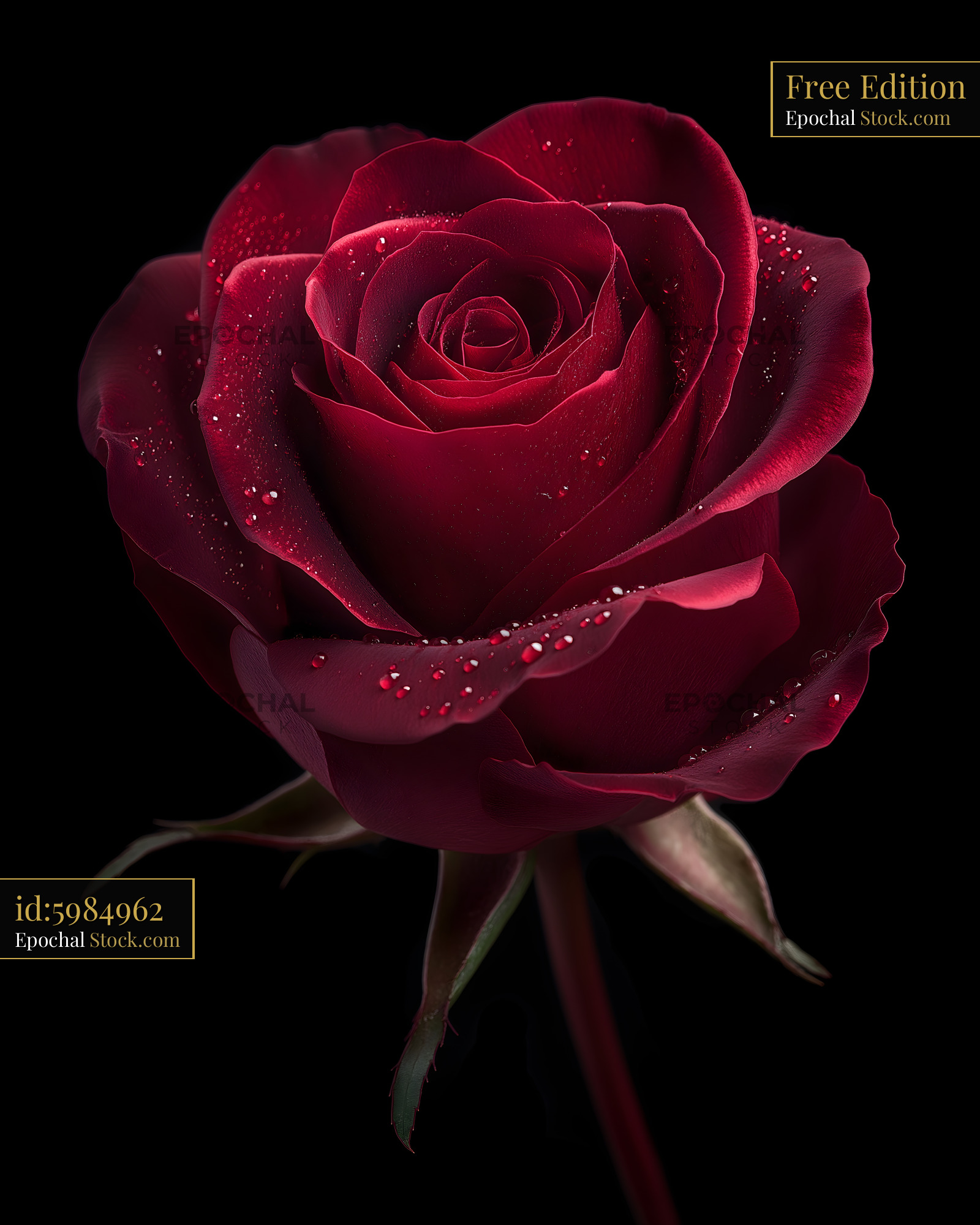 A single red rose is shown with water droplets on its petals. The rose stands tall against a black background. The petals appear fresh and vibrant, highlighting its natural beauty.