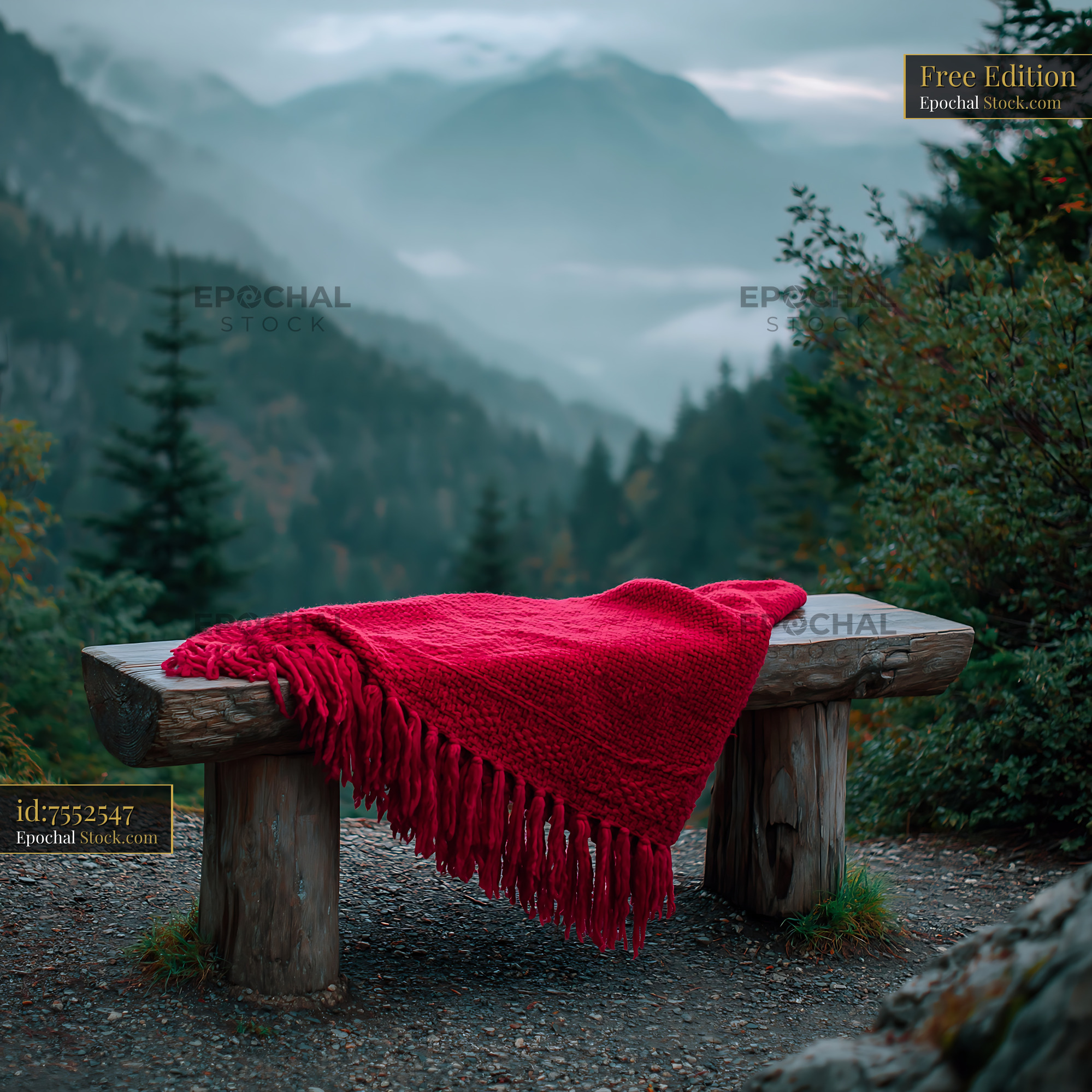 A vibrant red knitted throw lies on a weathered wooden bench against misty mountains and pine forests, evoking a sense of cozy solitude and peaceful waiting.