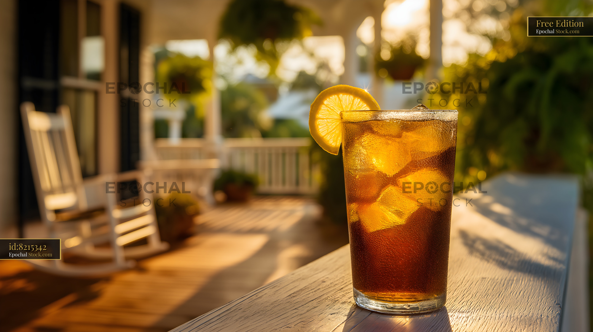 A glass filled with iced tea sits on a white table. The sun sets behind a porch with rocking chairs and plants. The atmosphere shows a calm evening vibe with warm light.