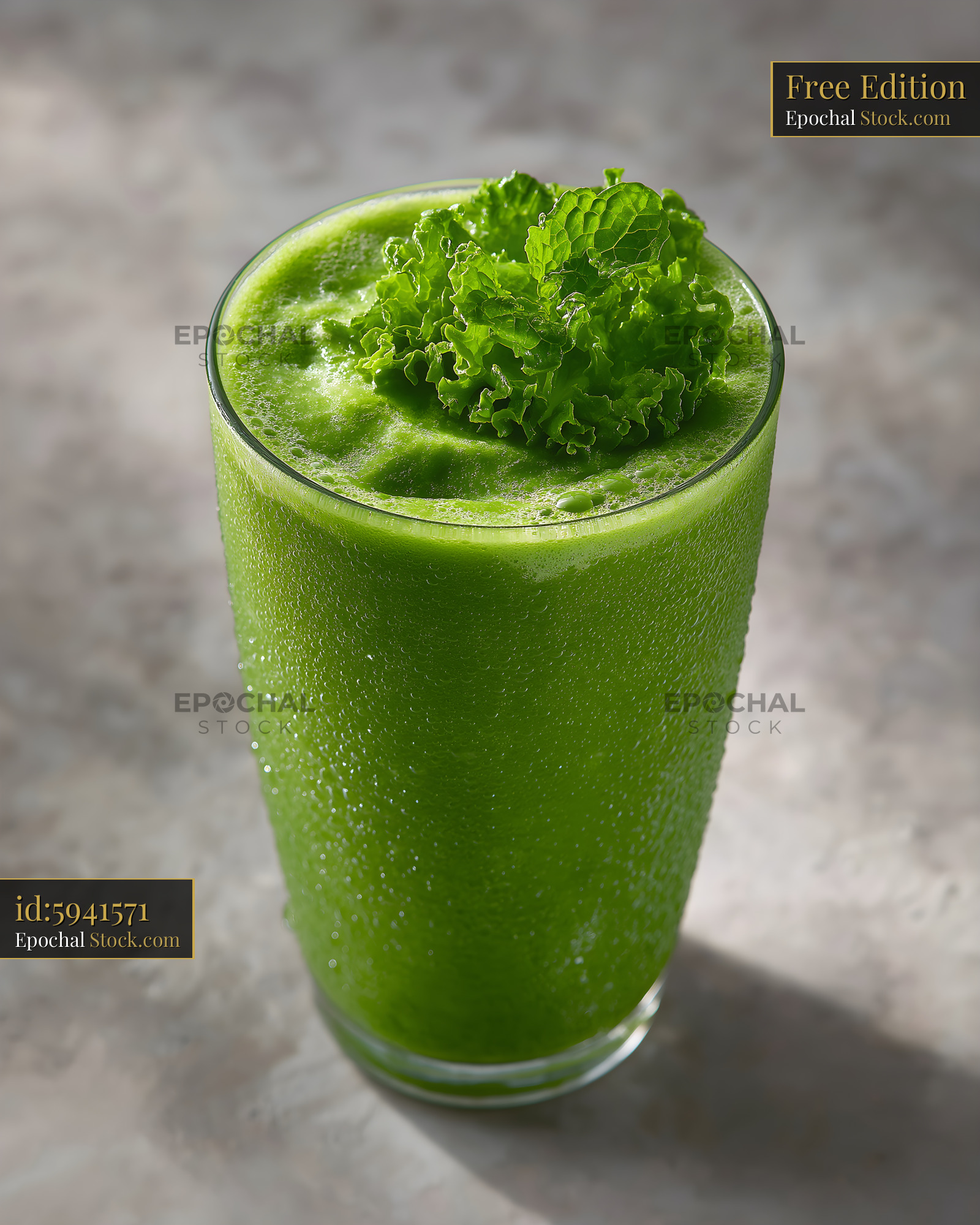 A tall glass holds a bright green drink, iced and cold. The drink is topped with fresh leafy greens. Moisture collects on the outside of the glass.