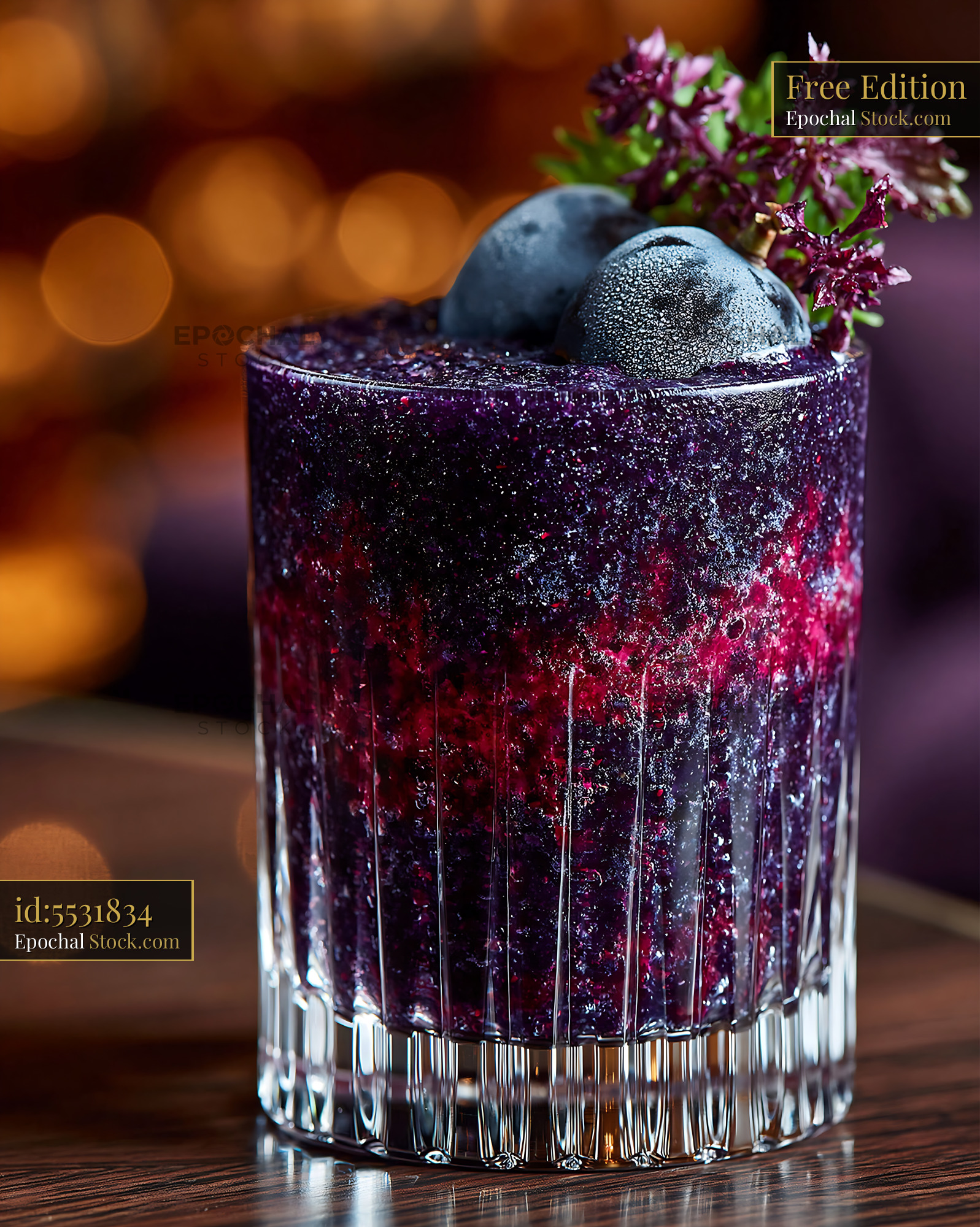 Vibrant purple kyoho grape smoothie in a textured glass, garnished with frozen fruit and shiso leaves, evoking a sophisticated and refreshing evening atmosphere in an elegant bar.