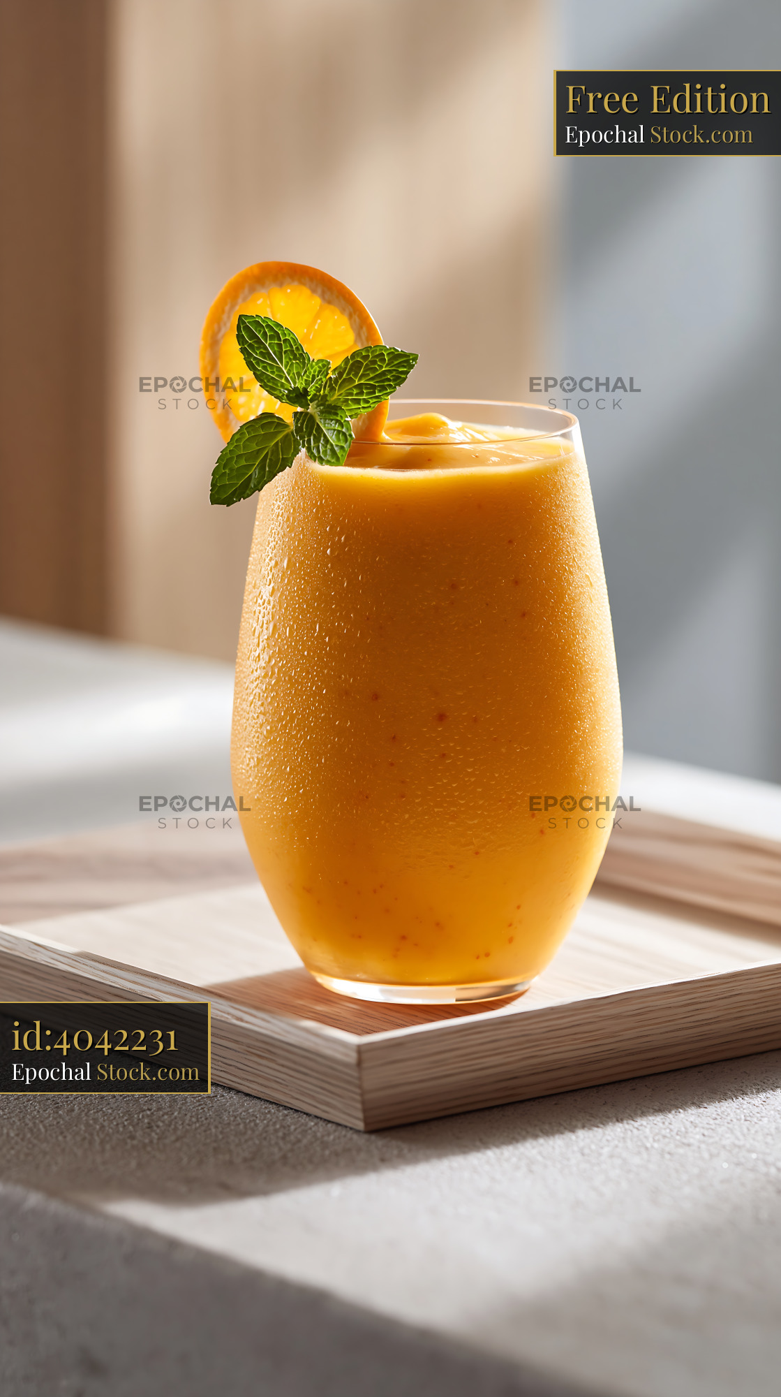 A chilled mikan orange smoothie on a wooden tray, decorated with fresh mint and a citrus slice, capturing a moment of healthy morning vitality and refreshment.