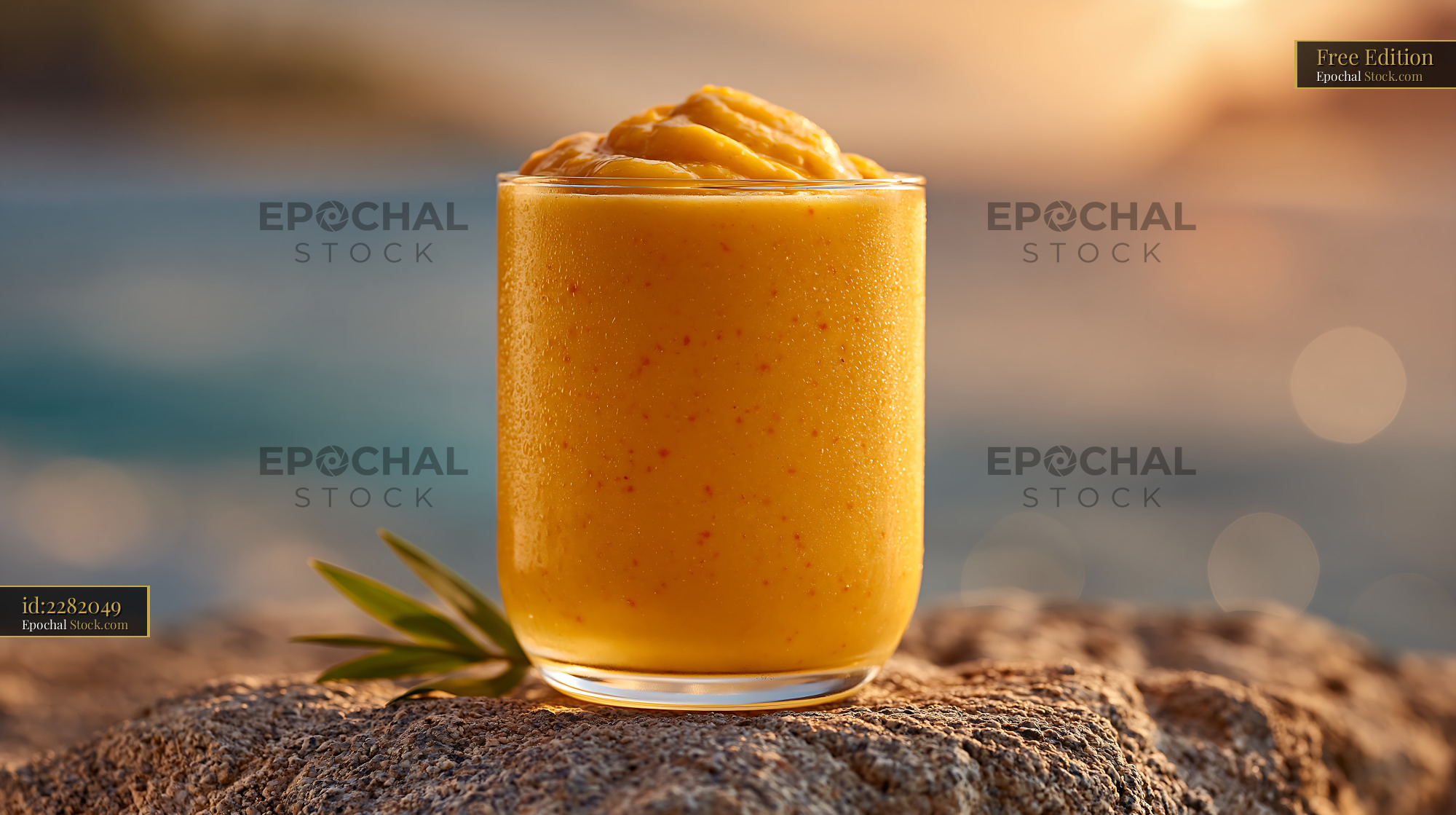 A chilled pawpaw punch milkshake sits on a rugged rock, capturing the essence of a tropical summer vacation as the sun sets over the ocean, evoking relaxation and health.