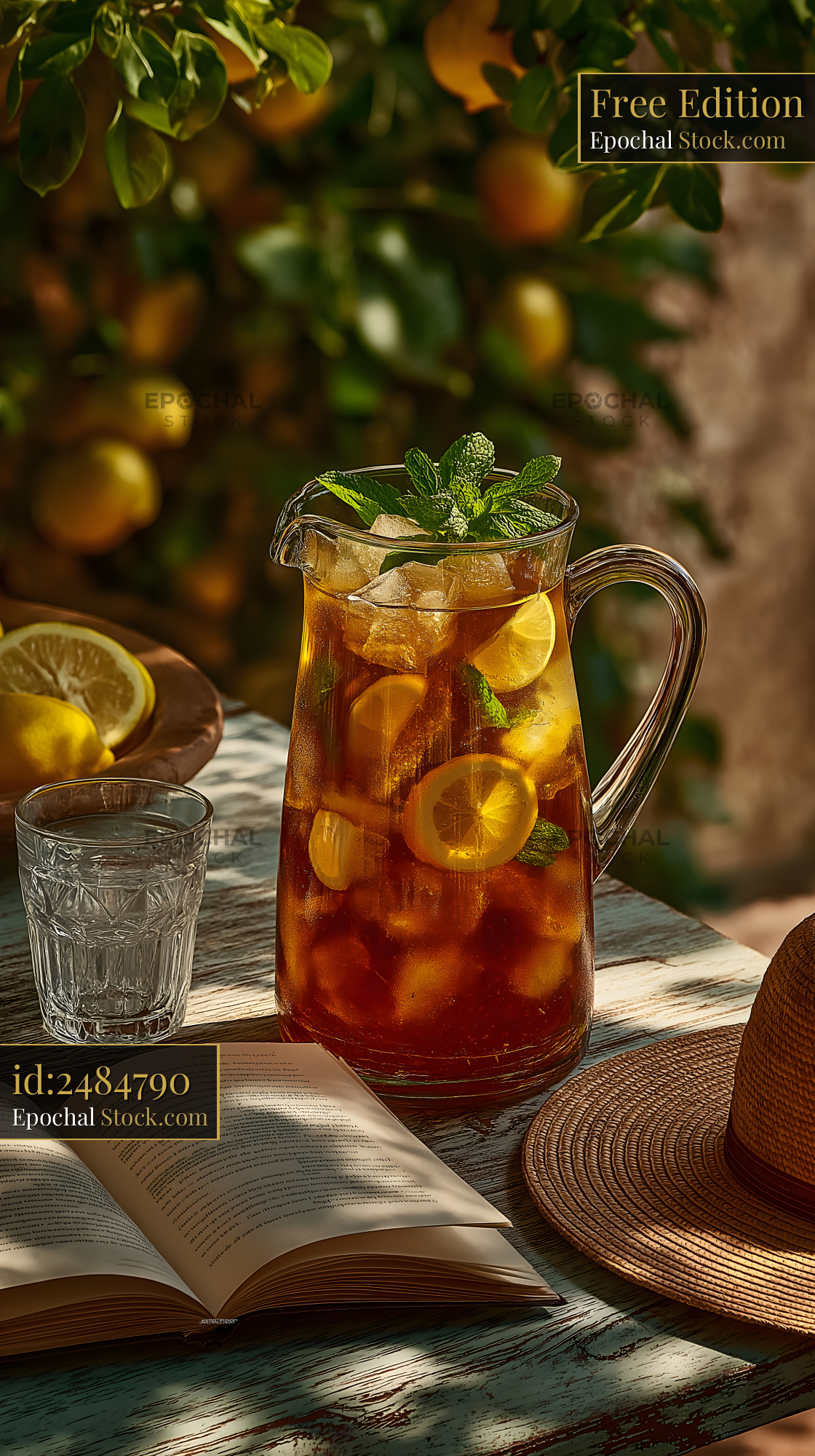 A clear pitcher filled with iced tea, lemon slices, and mint leaves sits on a wooden table. A glass of tea, a book, and a hat are nearby. Lemons hang from branches above.
